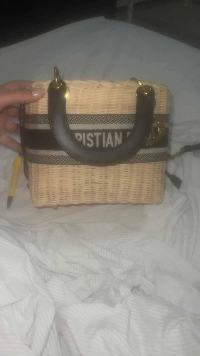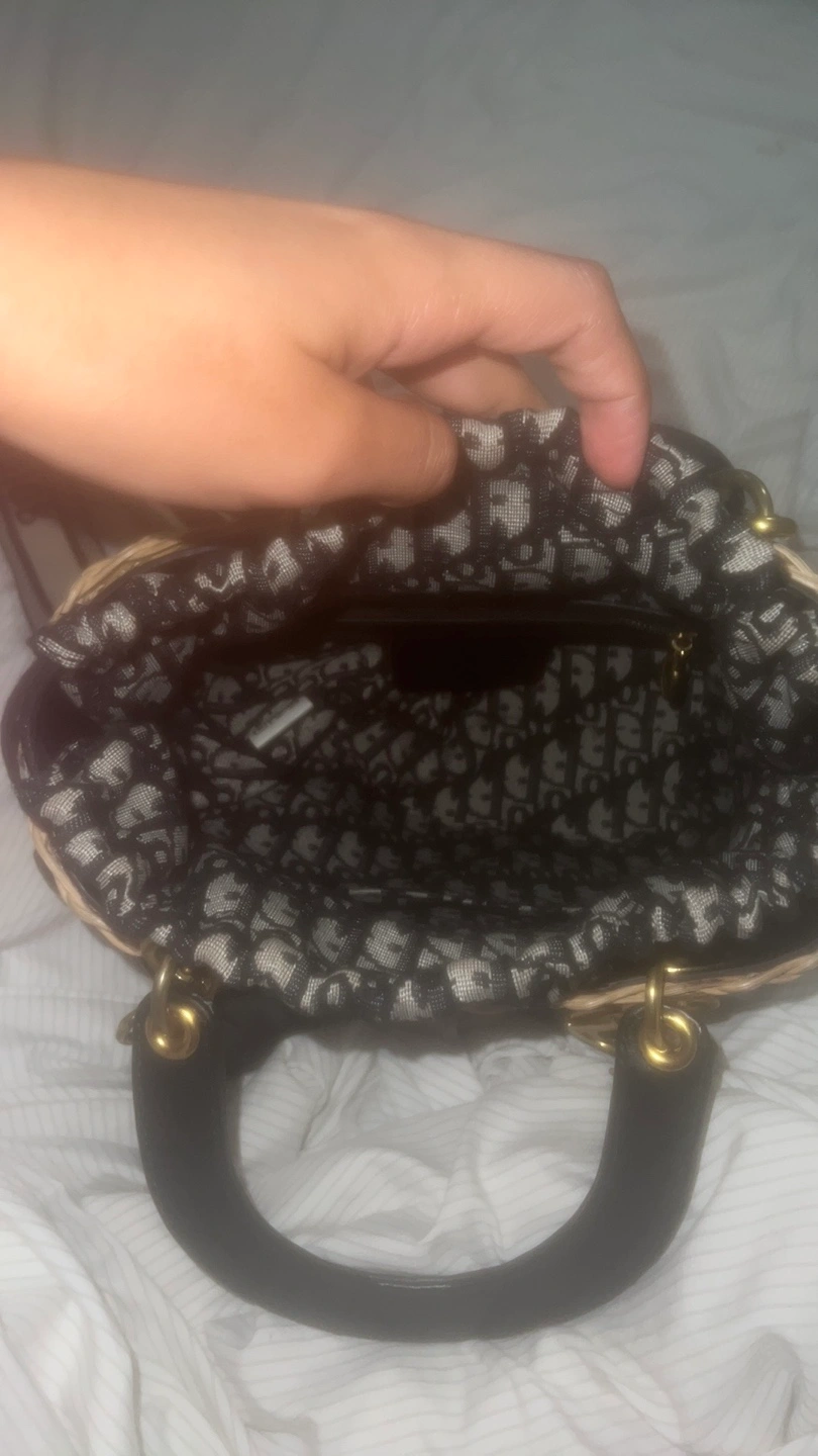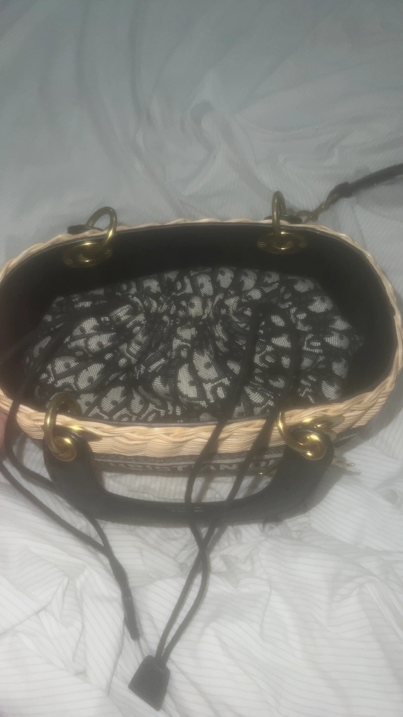 60Woven handbag with a pattern lining. Features a shoulder strap. Perfect for carrying your essentials while taking a stroll. The bag has a top handle and gold-tone hardware. No authentic
