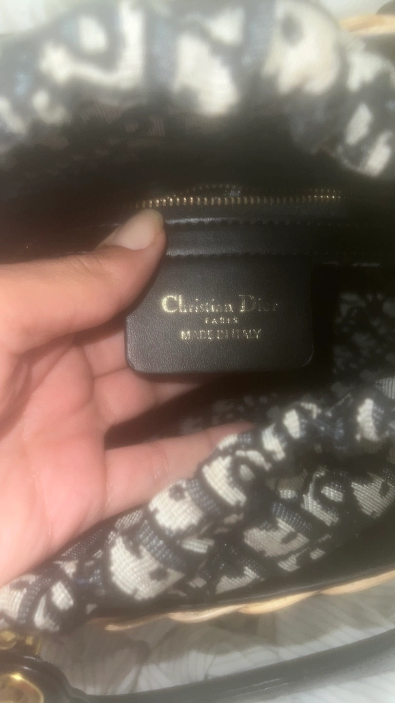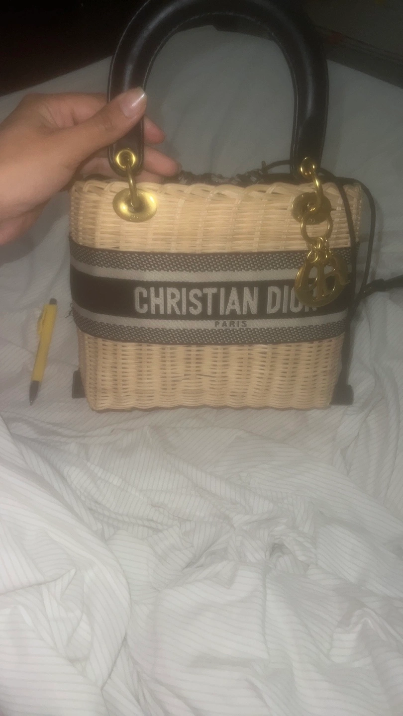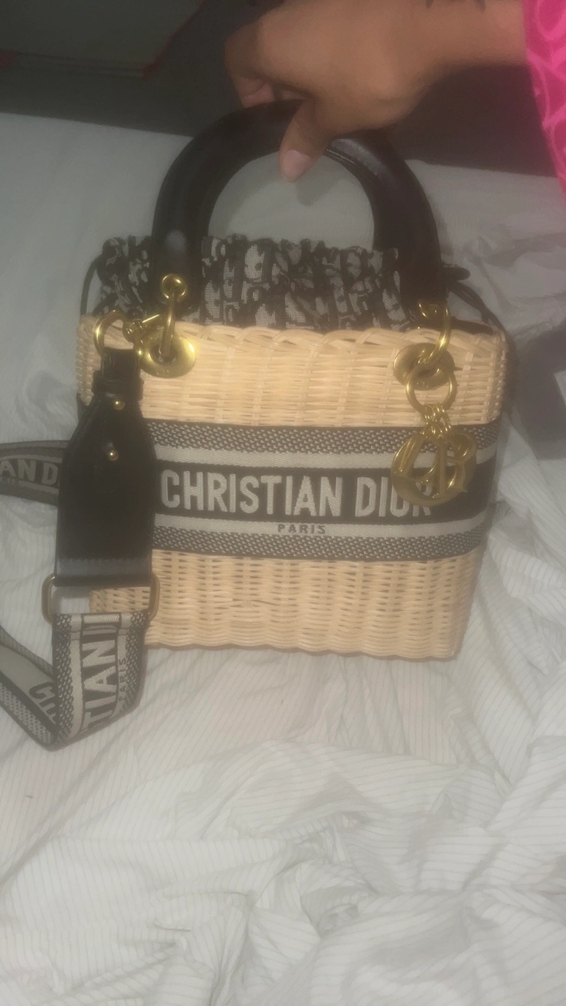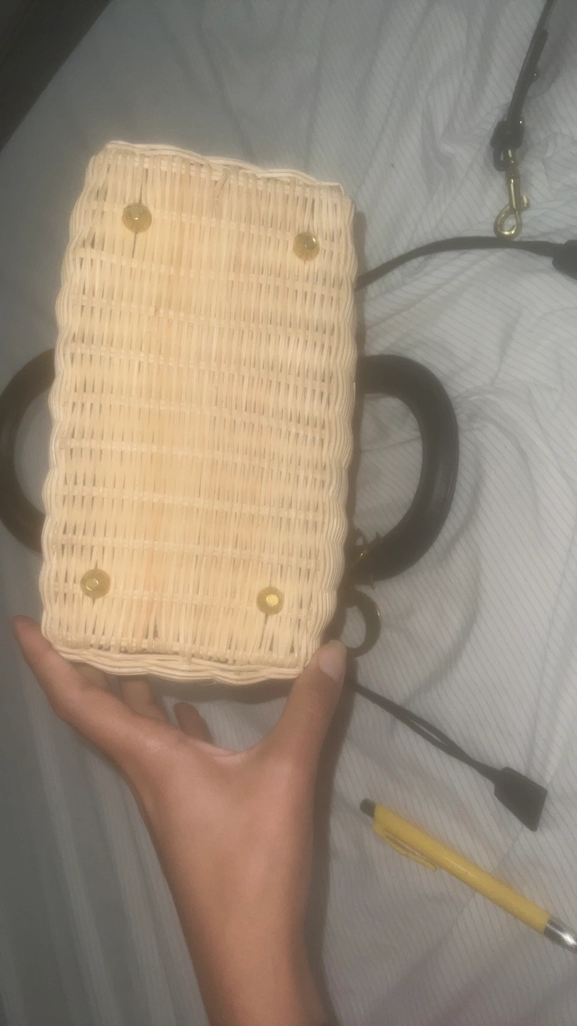 60Woven handbag with a pattern lining. Features a shoulder strap. Perfect for carrying your essentials while taking a stroll. The bag has a top handle and gold-tone hardware. No authentic