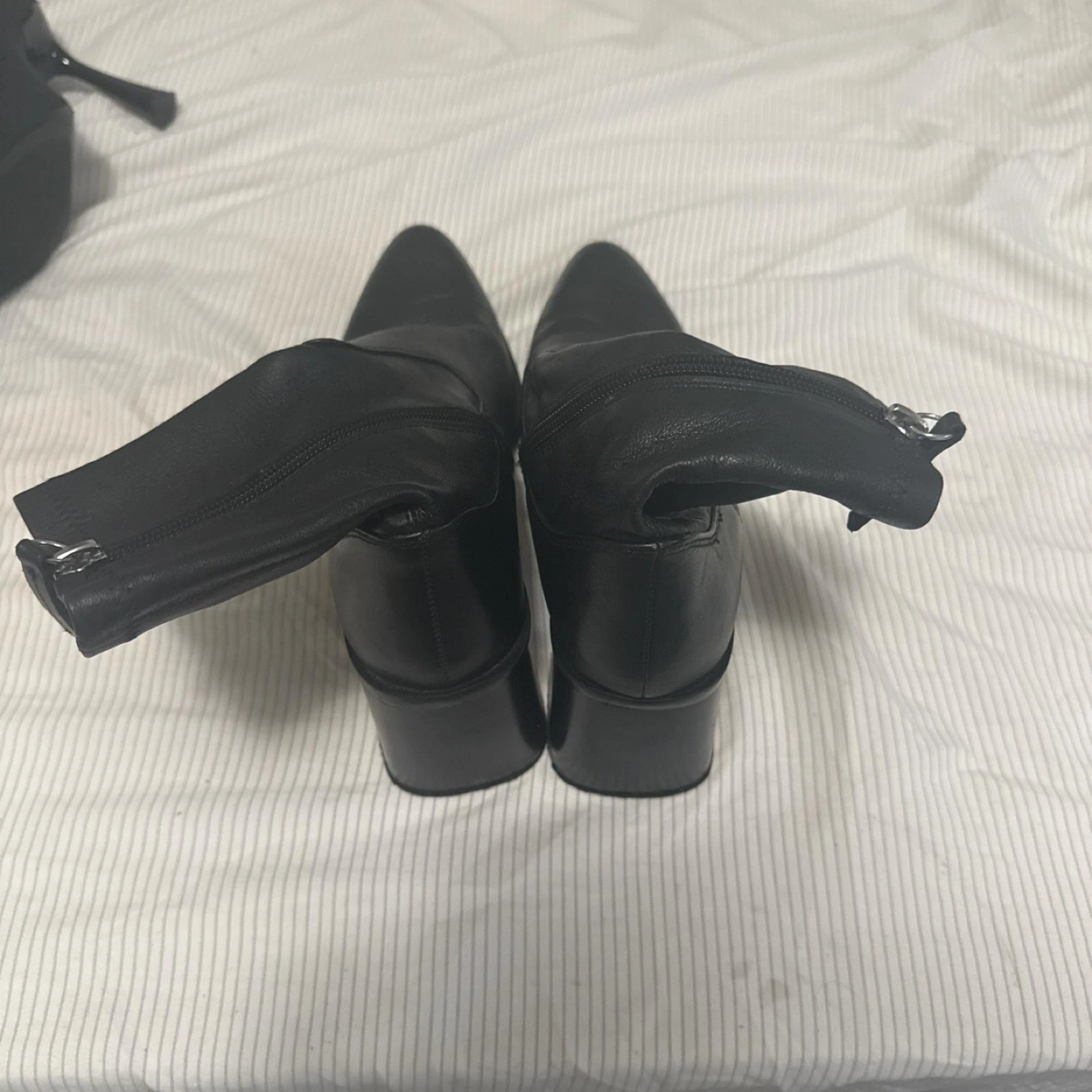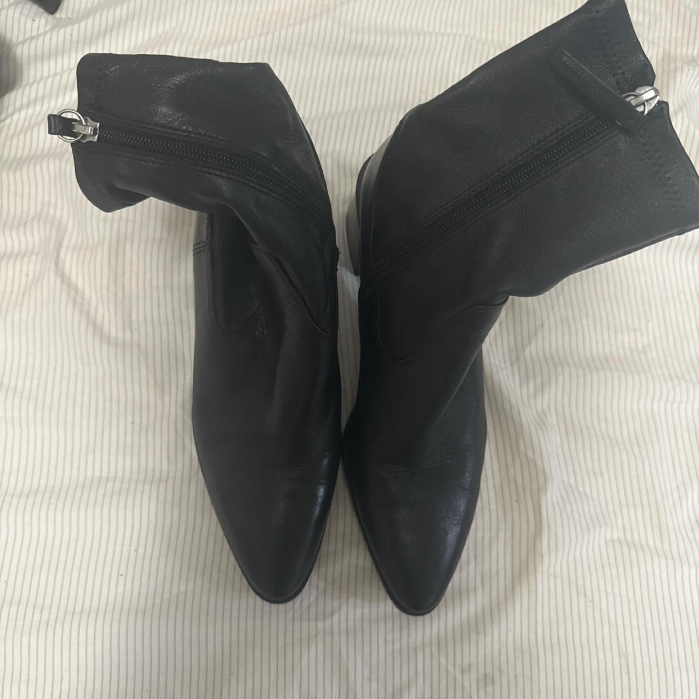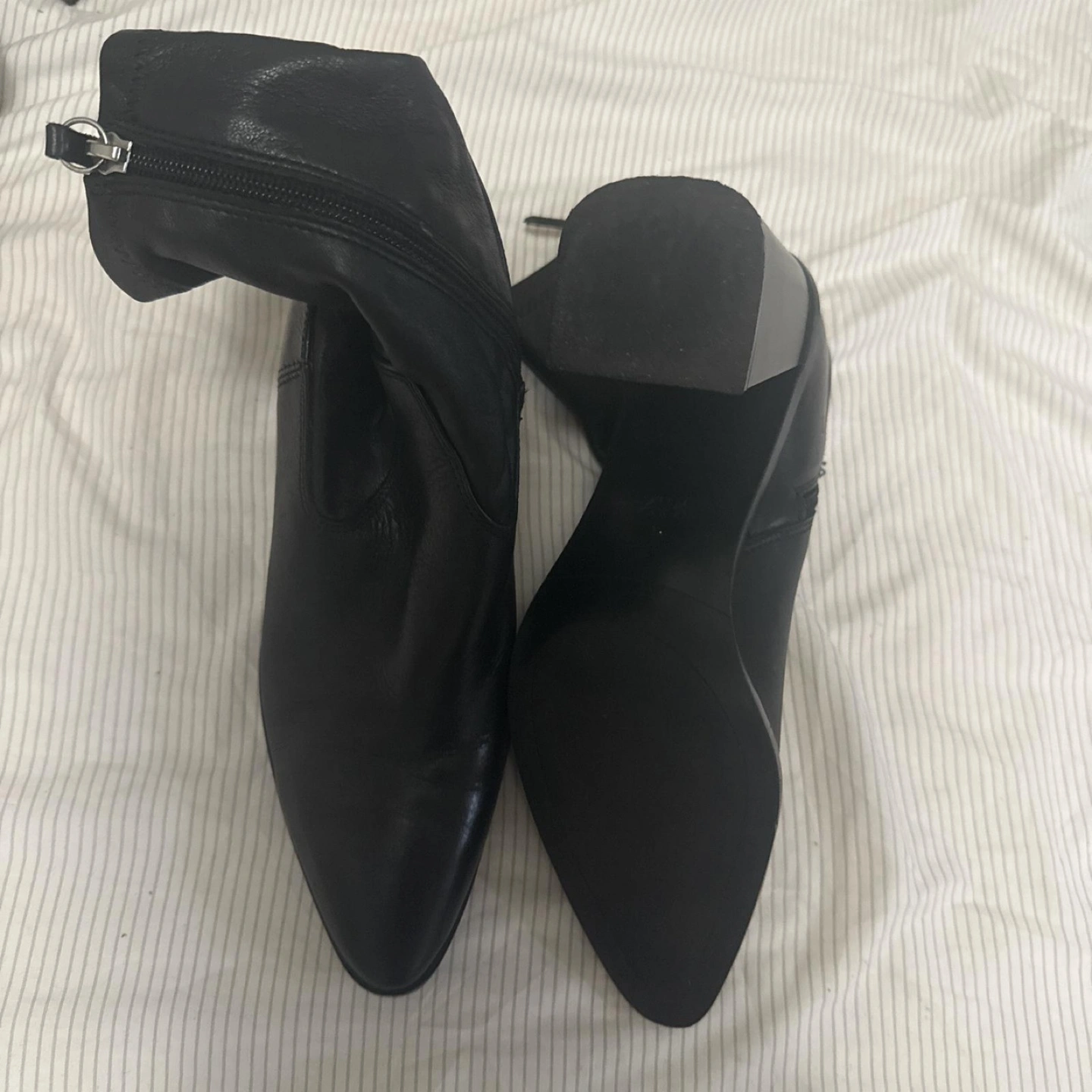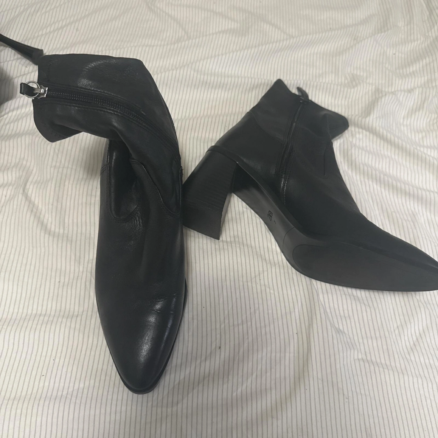 60Black leather boots. Pointed toe design. Zipper closure. Block heels. These boots would be perfect for a walk on a crisp fall day.