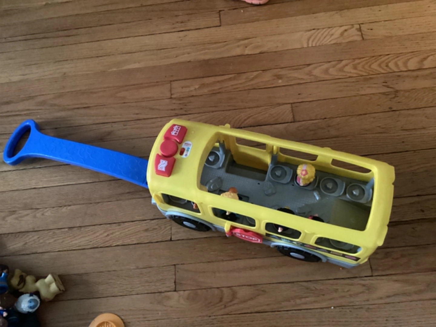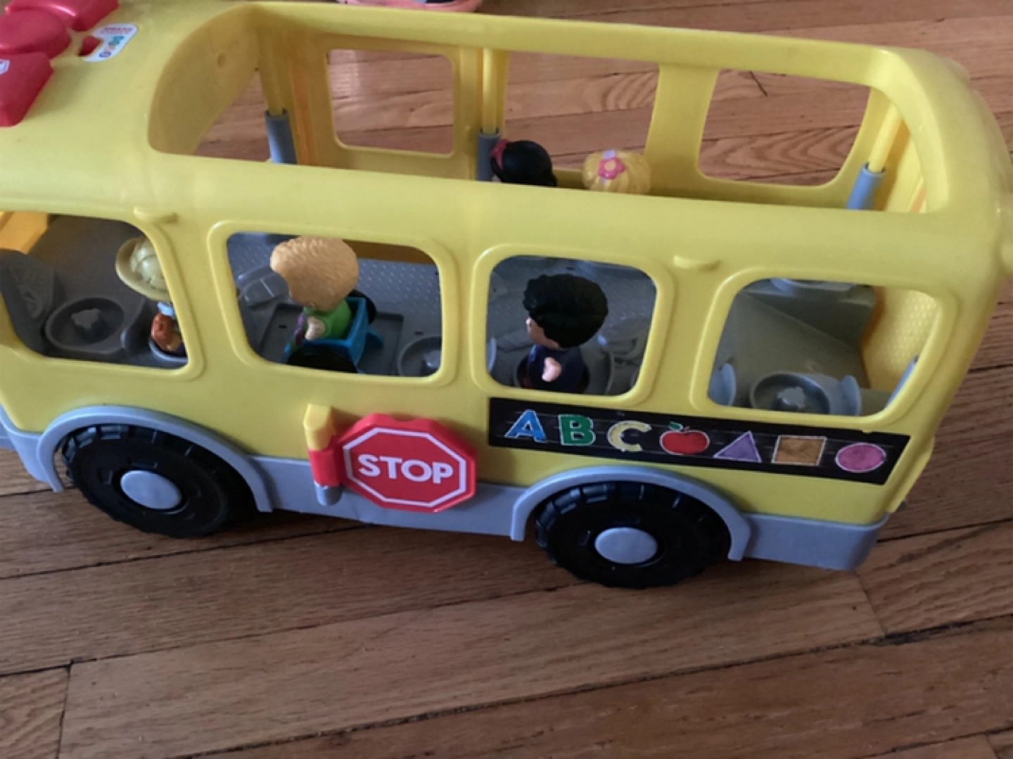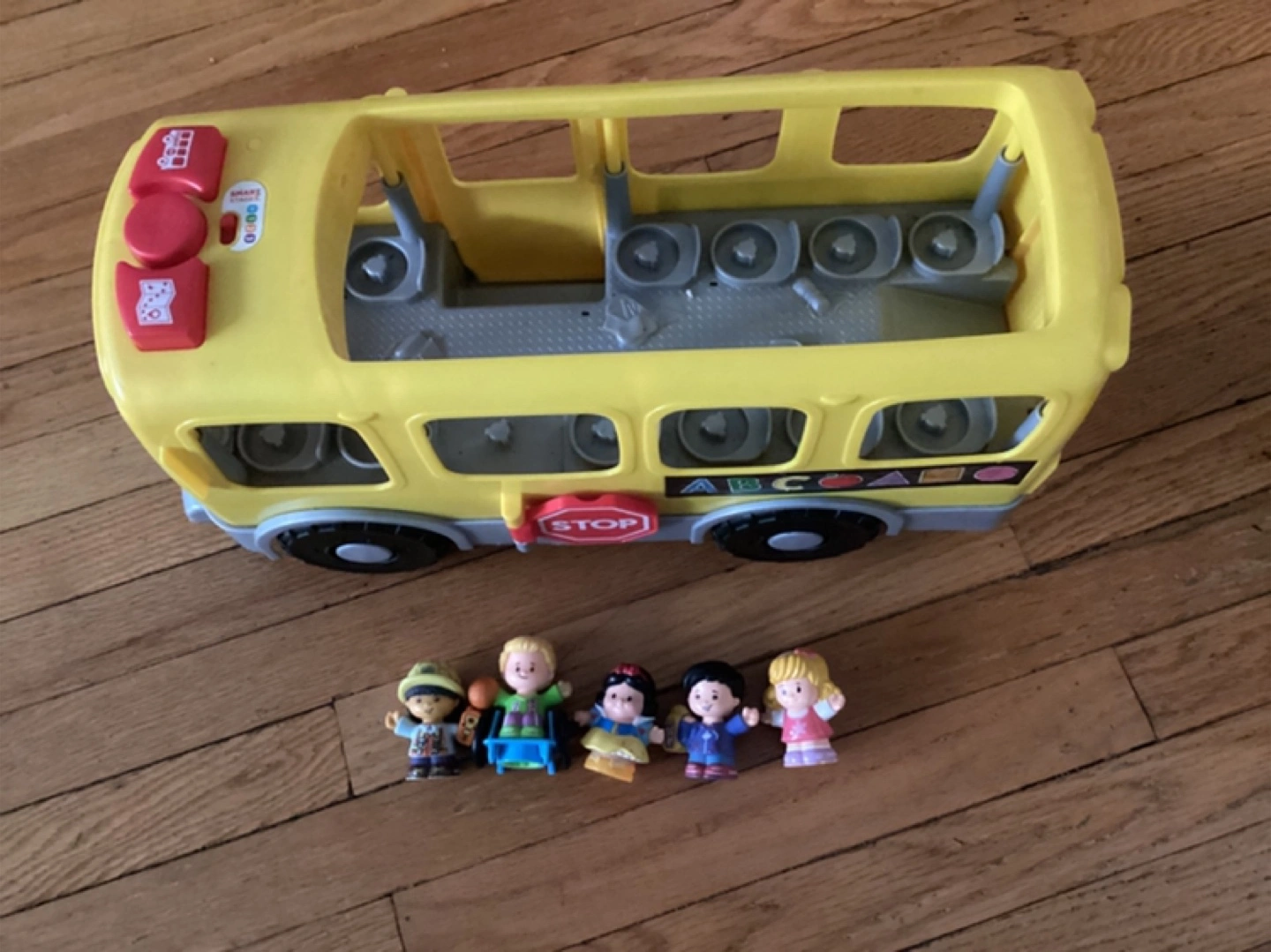 370A yellow school bus toy with little people figures. Has ABCs and shapes on the side. You could use it to gently teach children shapes and colors. Had working sounds and 5 figurines.