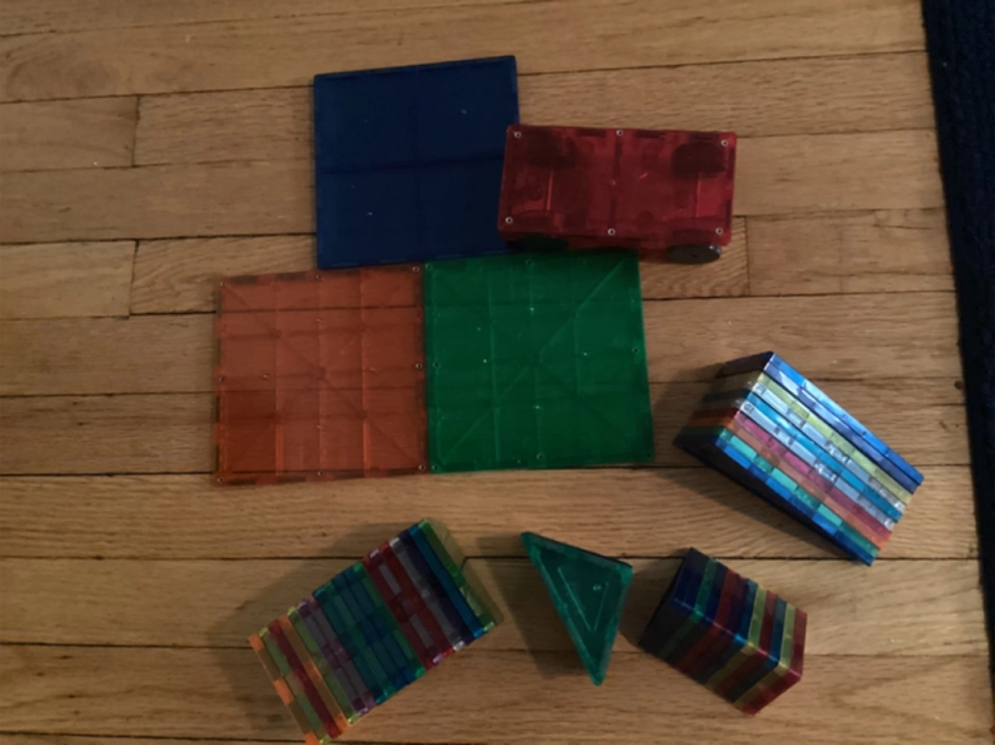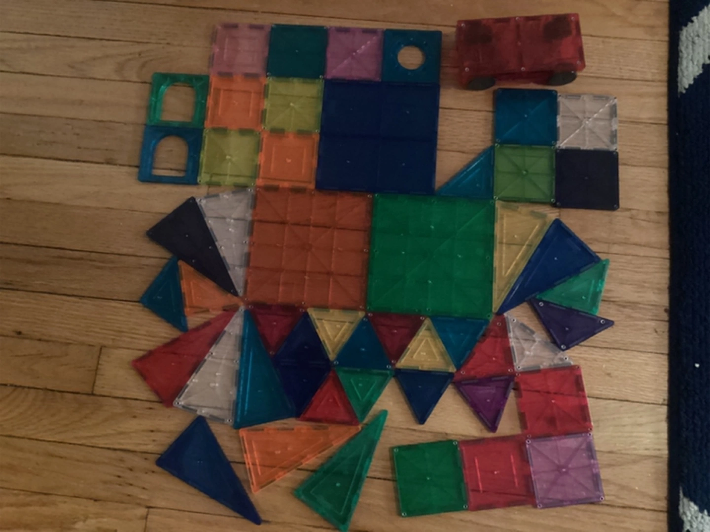 Assorted shapes and colors. Translucent. Great for hours of creative construction and a calming experience for kids. Features squares, triangles, and more. Includes a red vehicle piece.