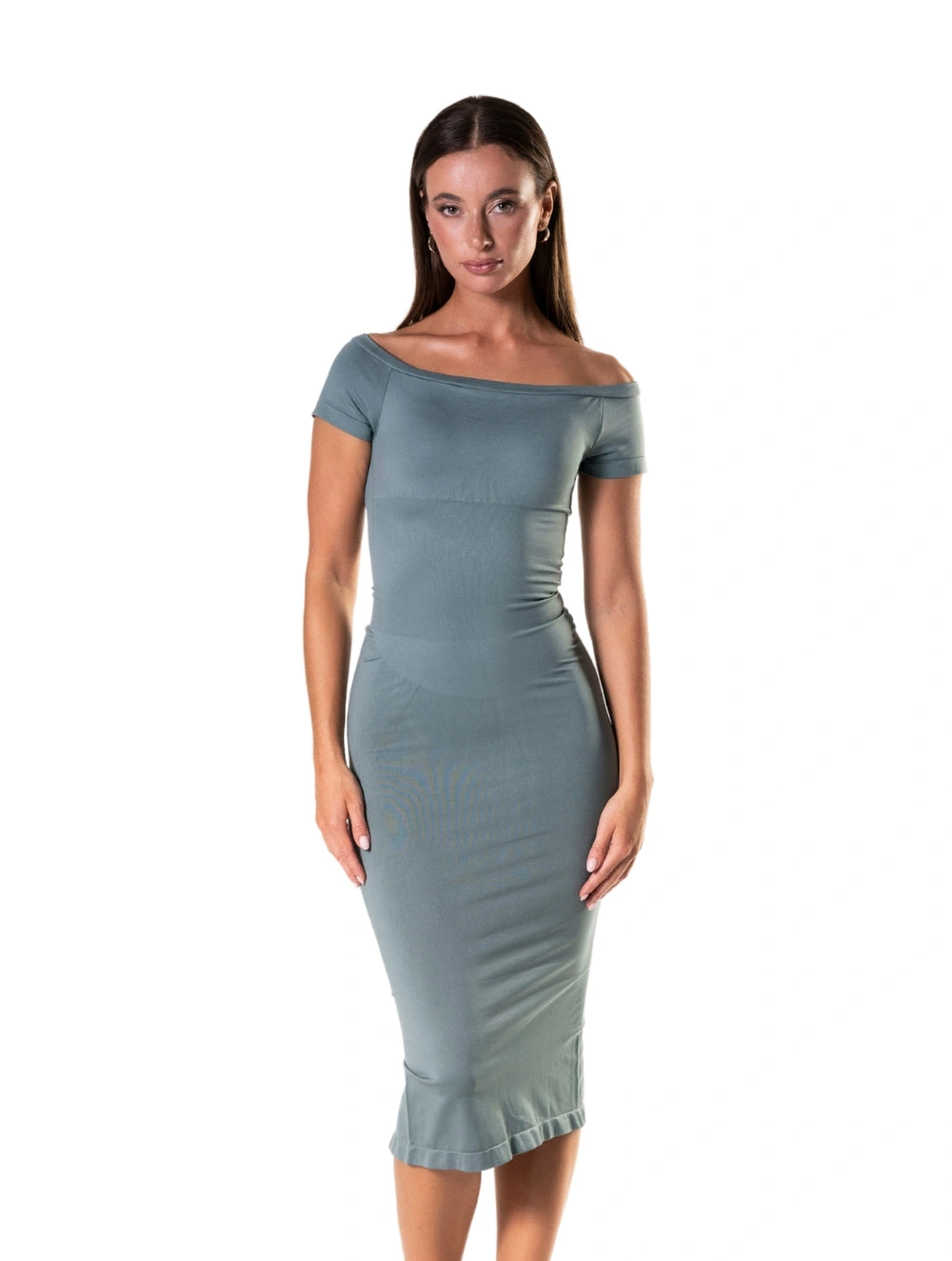 A midi dress in a soft muted color. Features an off-the-shoulder neckline and short sleeves. Such a lovely choice for a casual weekend.