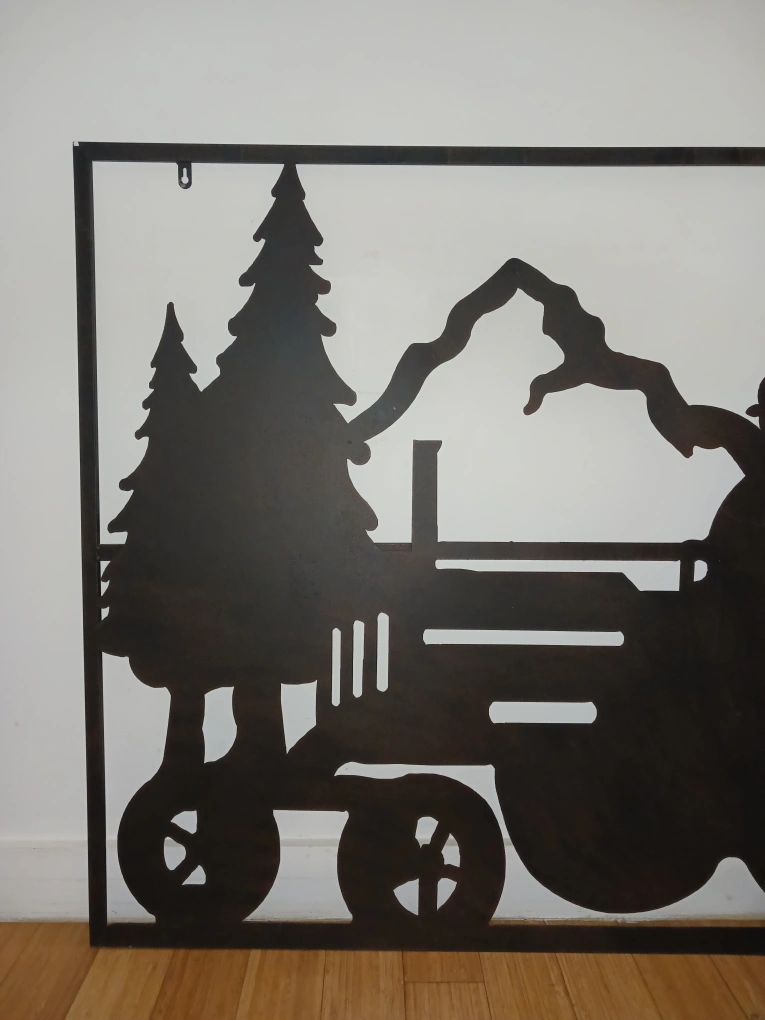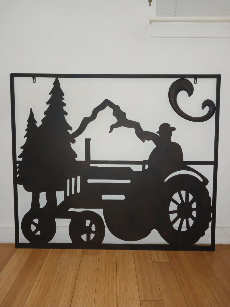 184Features a farmer driving a tractor in a landscape. A great addition to any farmhouse decor style. The metal art includes a frame and hanging hardware. Bring rustic charm to your space with this beautifully crafted metal wall art panel. Featuring a silhouette of a farmer on a tractor set against a scenic mountain backdrop with pine trees and swirling clouds, this piece captures the essence of country life and outdoor adventure. Material: Durable black powder-coated metal Design: Intricate cut-out depicting a classic rural scene with trees, mountains, and a vintage tractor Mounting: Includes two hooks for easy hanging Ideal For: Farmhouse decor, cabins, living rooms, entryways, or outdoor spaces This striking artwork is perfect for those who appreciate farming heritage, nature, or unique handcrafted pieces. A wonderful gift or accent for any rustic-themed environment.