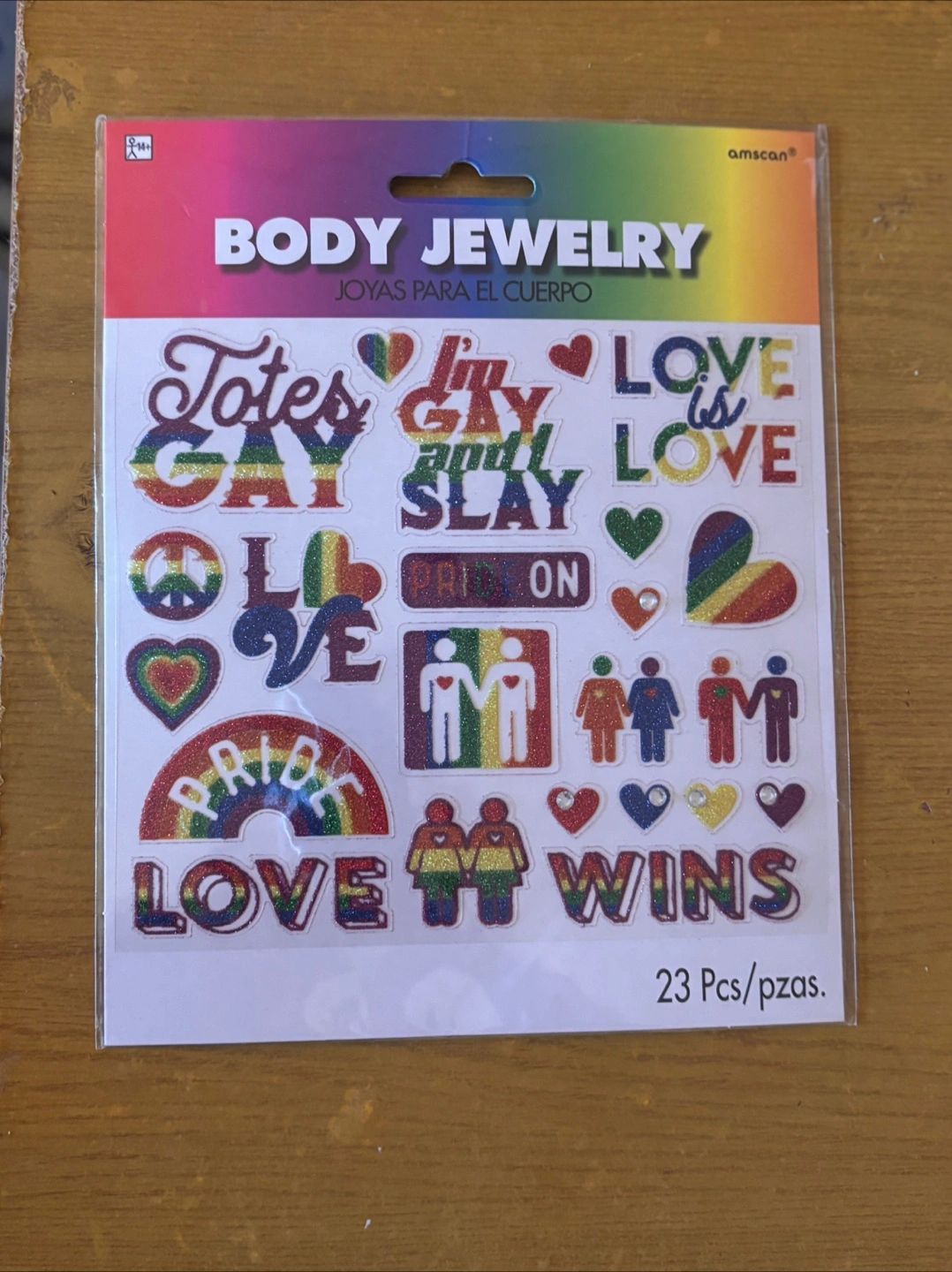 1000+Set of body jewelry stickers. Designs include rainbows and Pride related phrases. A fun way to express yourself. Great for celebrating Pride month .