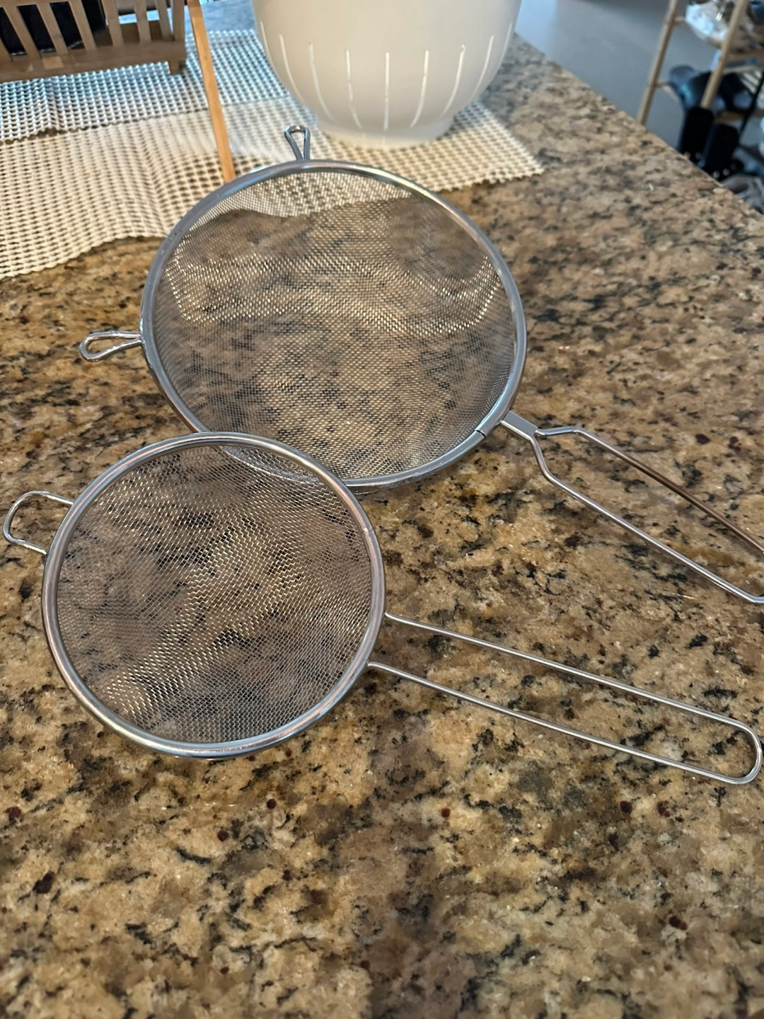 I am selling a set of stainless steel strainers. They appear to be of two different sizes. These are perfect for straining out impurities.