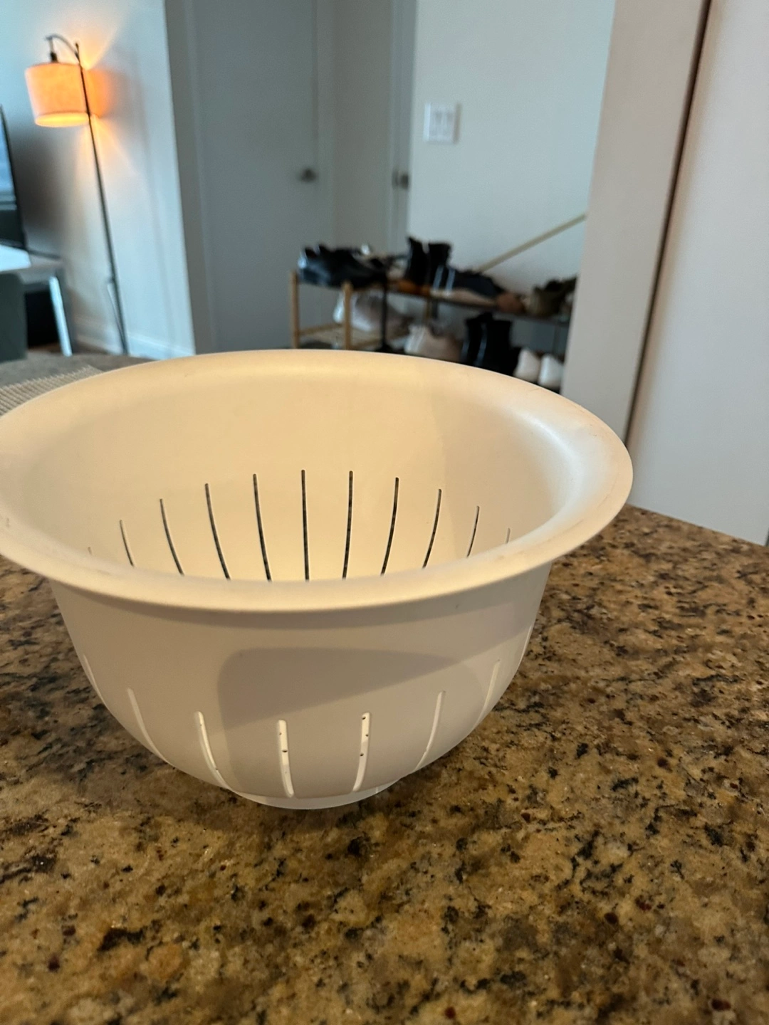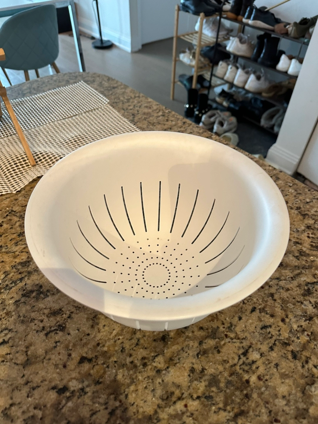 A round colander with plenty of drainage holes. Made of white plastic. It can be used for draining pasta or washing vegetables, allowing for a peaceful cooking experience.