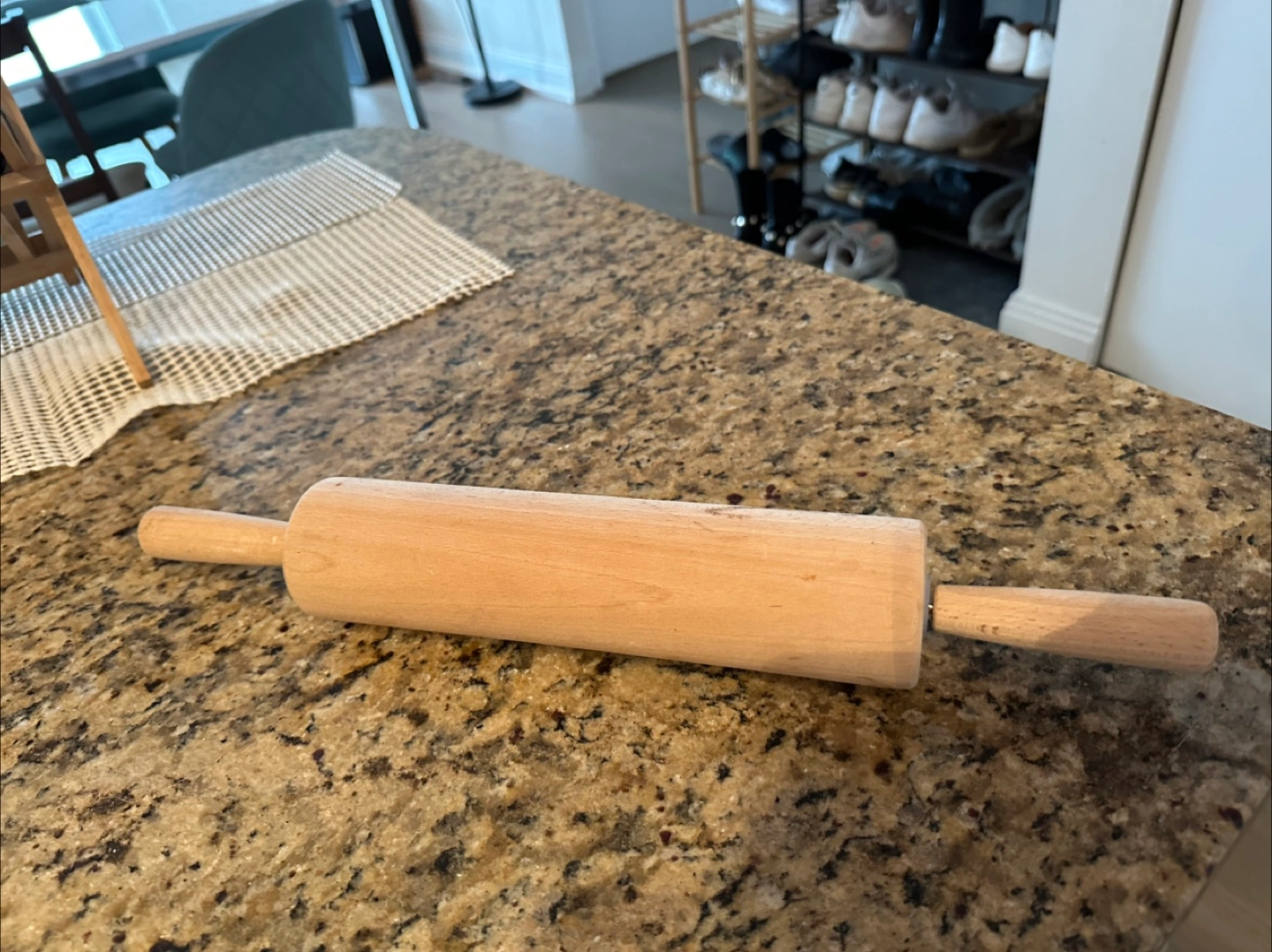 The perfect tool for baking pies, pastries, and more. It's a classic rolling pin, made of light wood. It features two handles on each side for easy rolling.