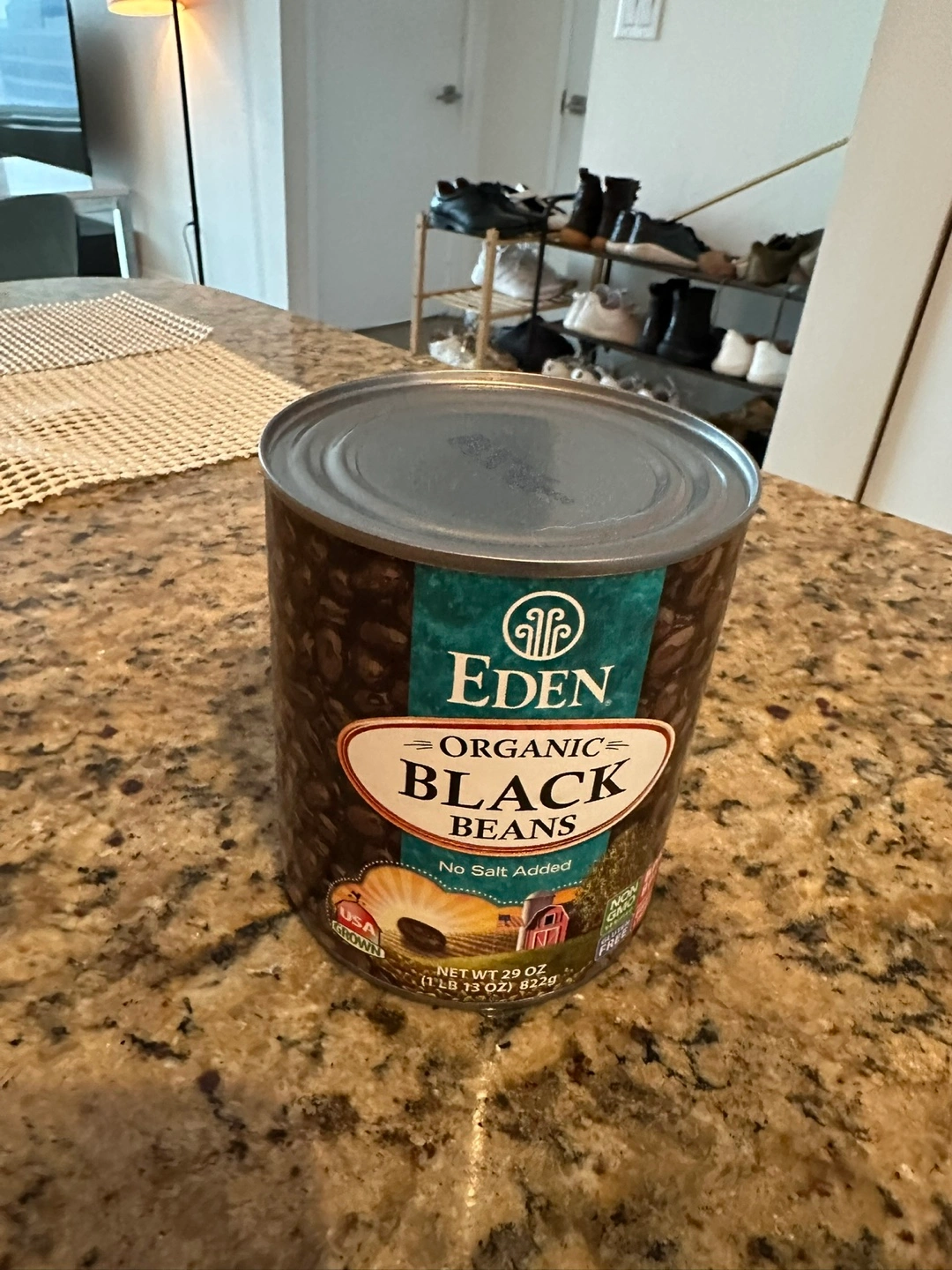 A can of organic black beans. No salt added. Net weight 29 oz. Prepare a tasty meal with these canned beans.