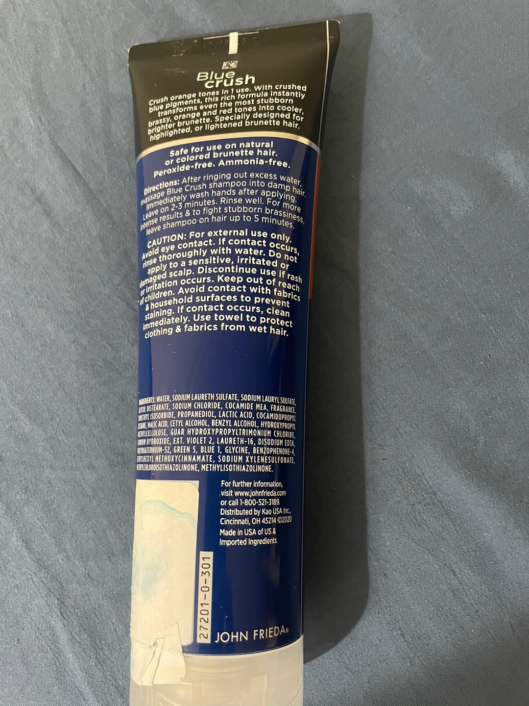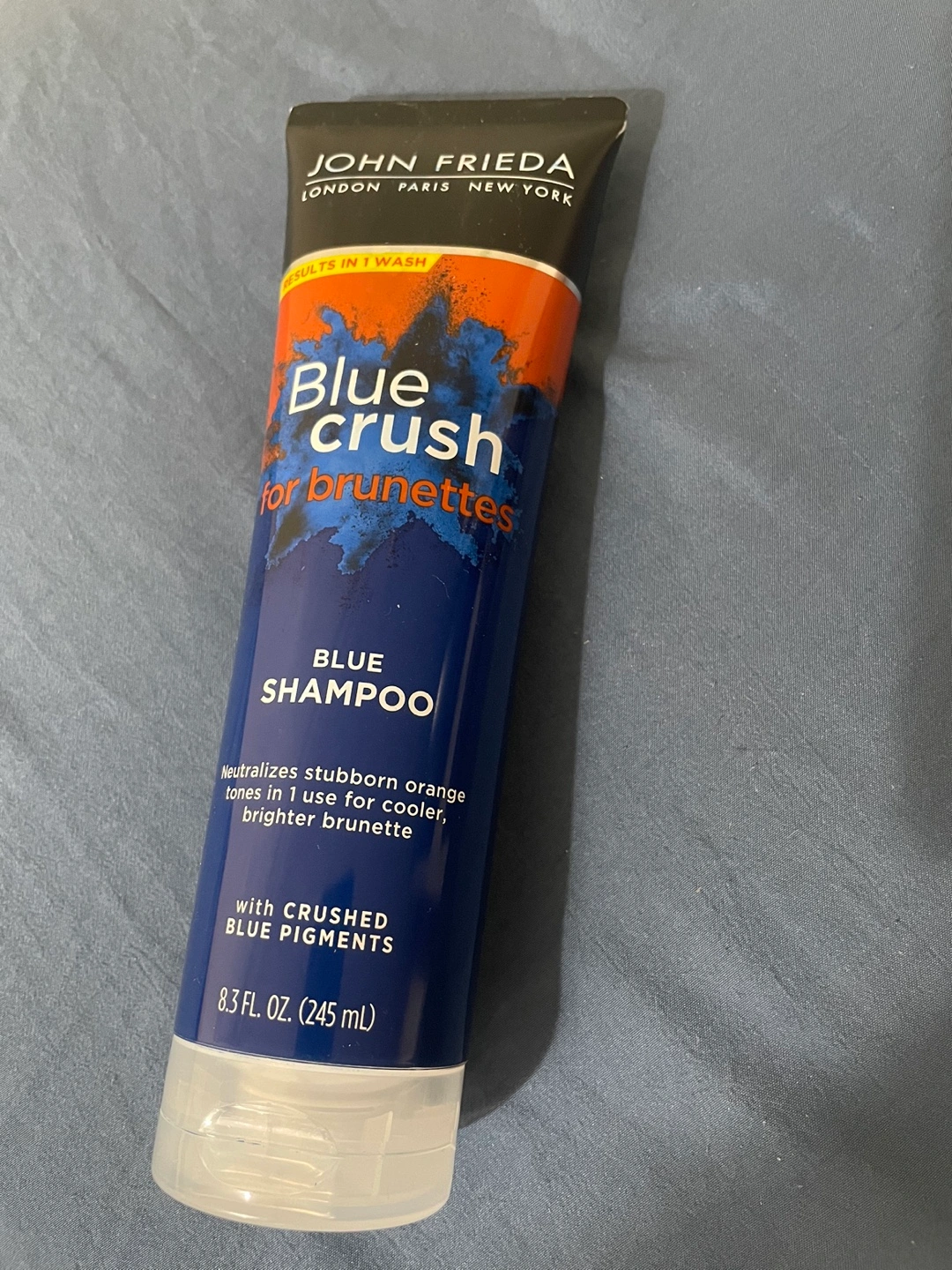 Blue shampoo neutralizes stubborn orange tones for cooler, brighter brunette. With crushed blue pigments.