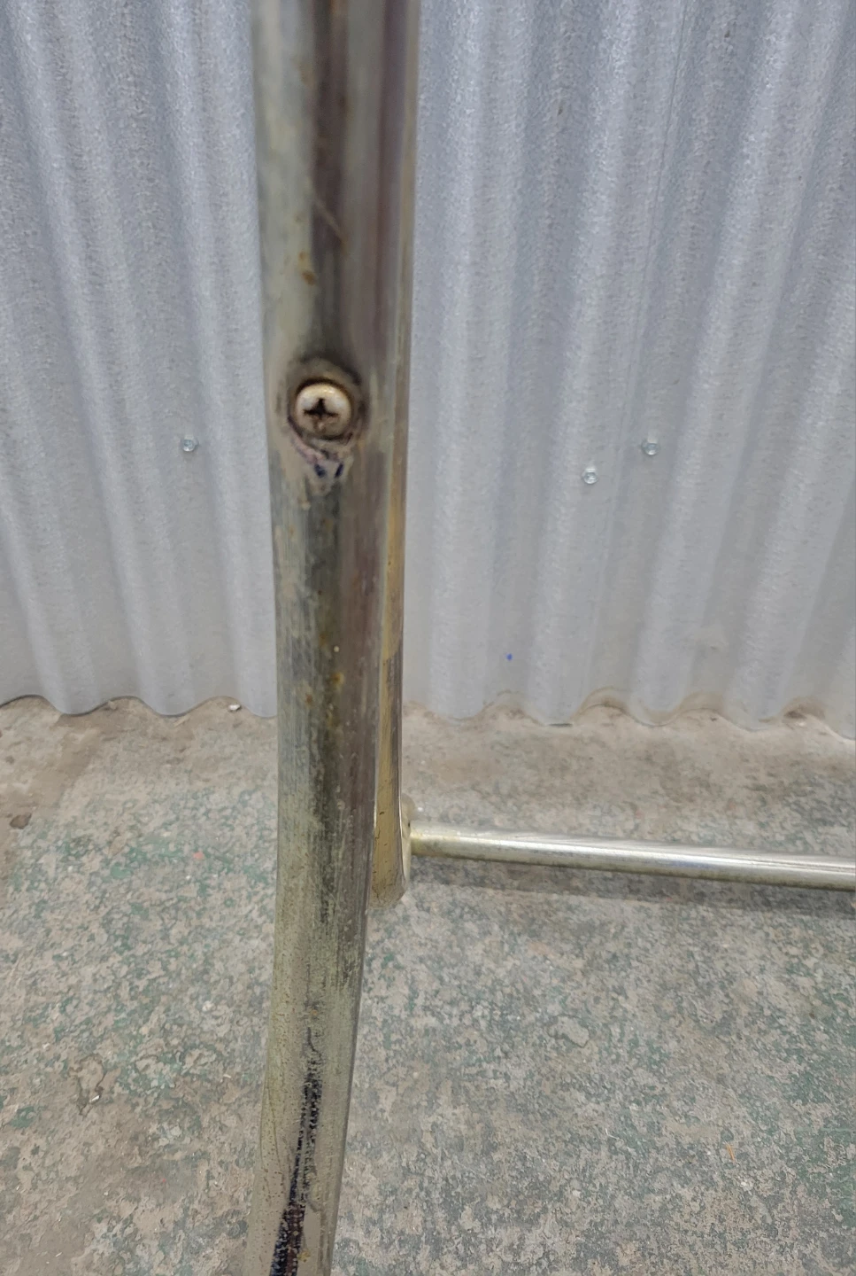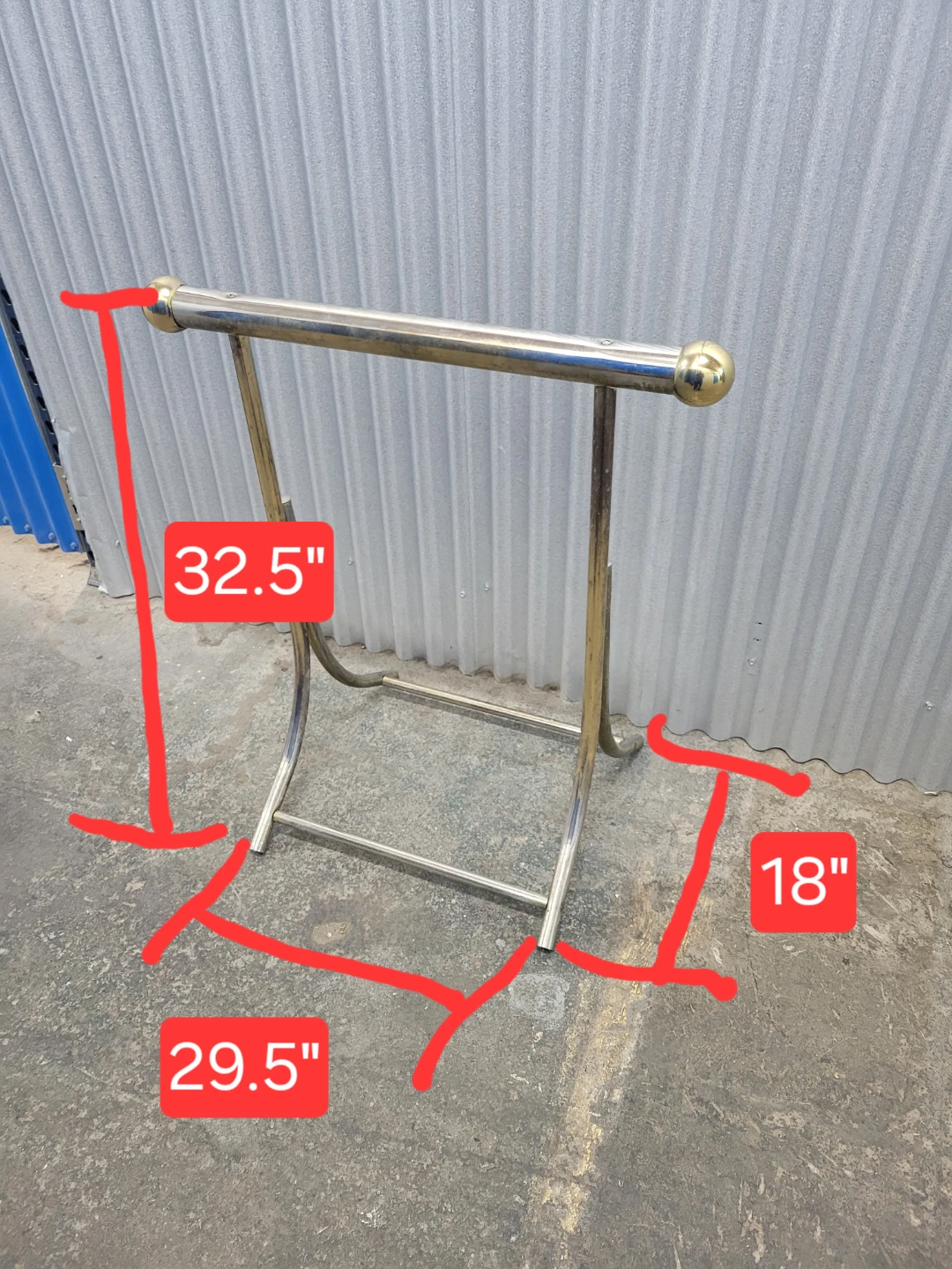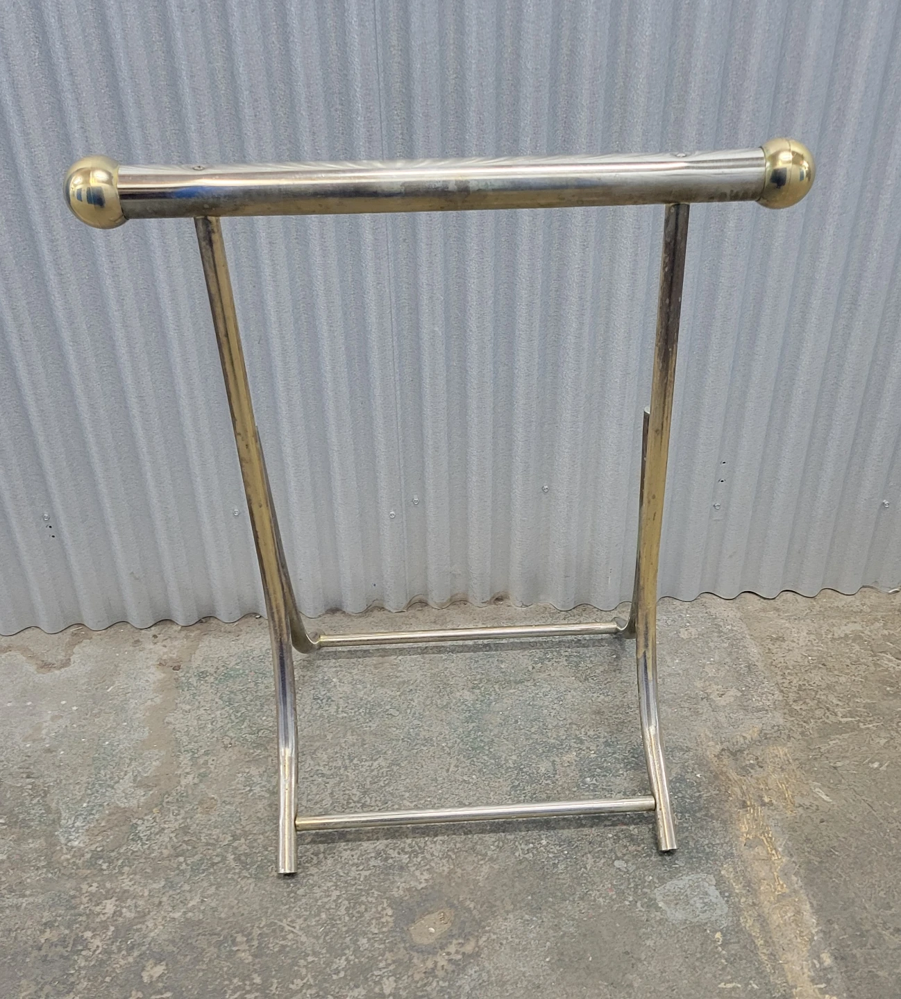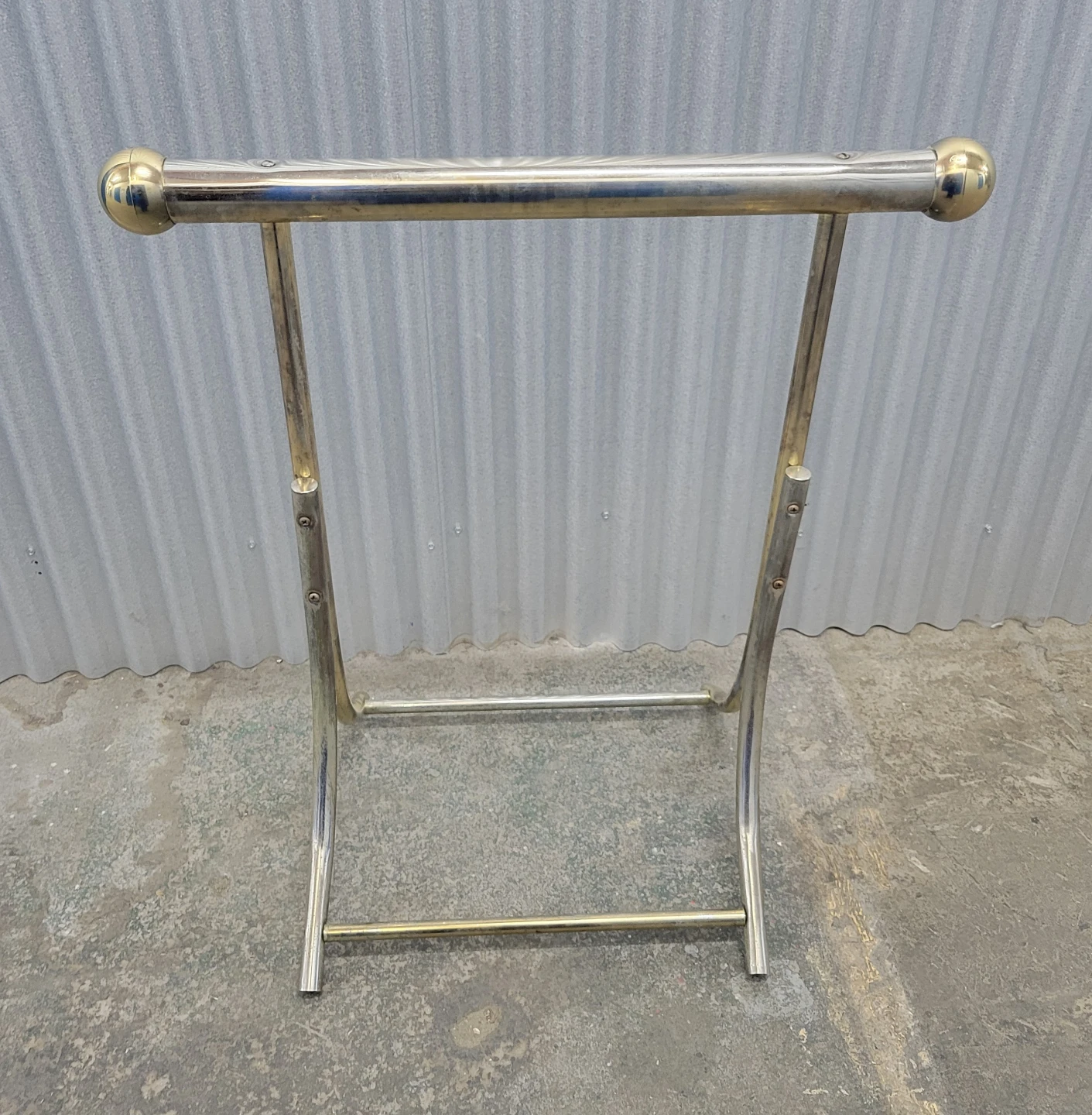 This is a vintage towel rack stand. It's made of brass and has a sleek, modern design. The stand features two decorative gold spheres on top. Measurements are on photo. Please see detailed pictures for a better idea of condition, thank you!