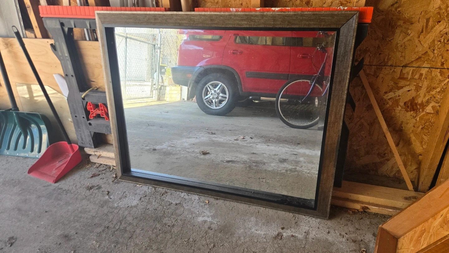 This is a rectangular wall mirror with a rustic wood-look frame. It's a substantial piece suitable for various rooms. Its simple design complements many decor styles. Perfect for adding depth and light to your space!