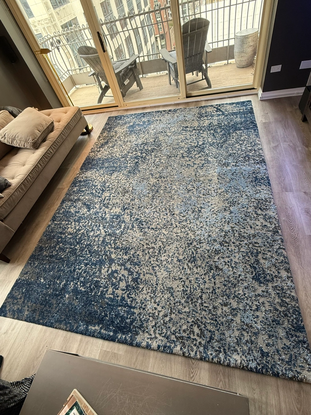 Beautiful large area rug. Features an abstract design in shades of blue and gray. Soft and comfortable underfoot. Perfect for living room or bedroom. Purchased from Walter E. Smithe a few years ago.