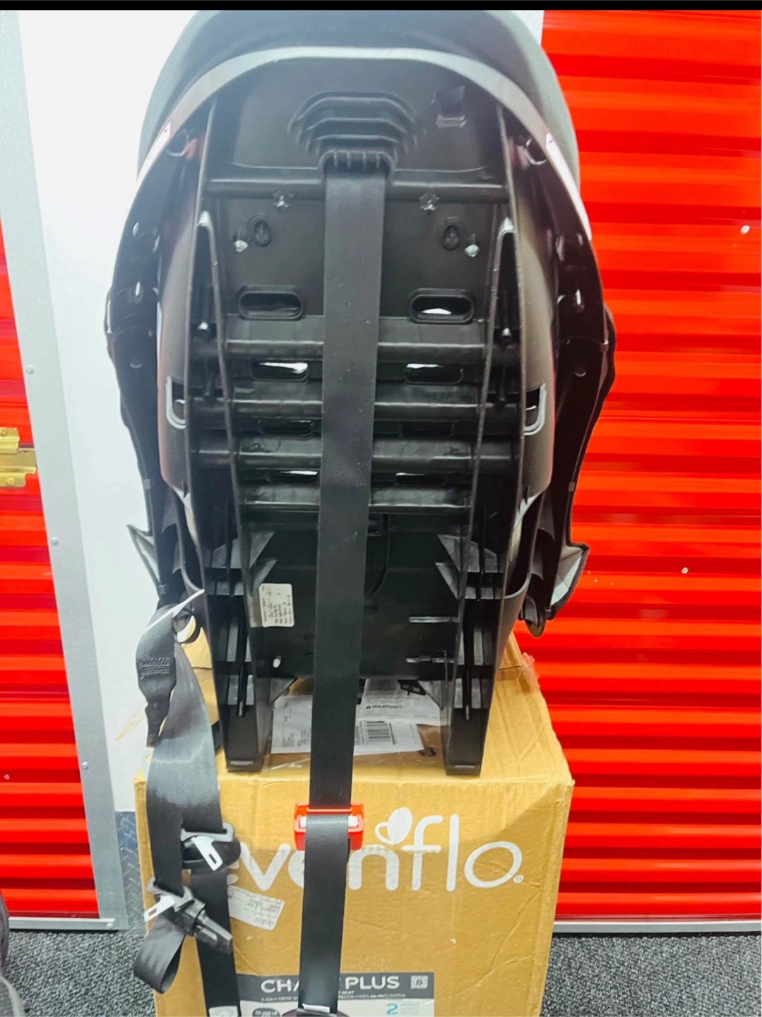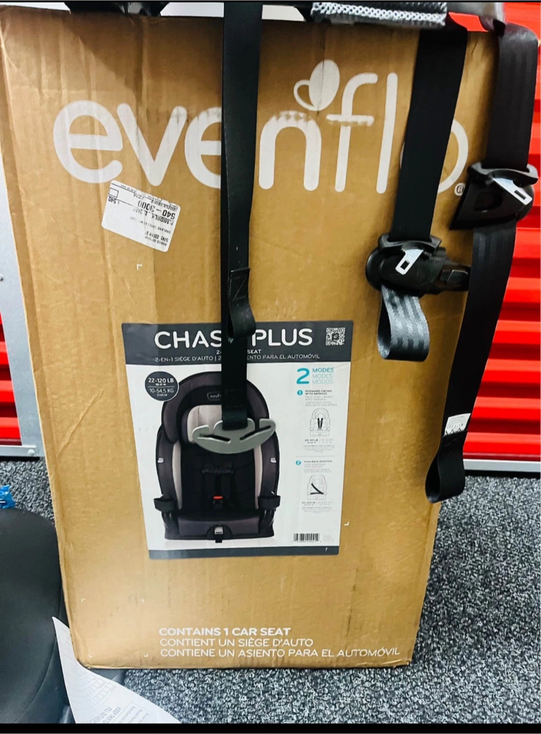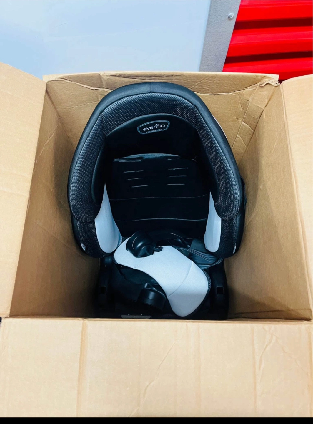 165A car seat in a box. Mostly black with some gray accents. There are cup holders, and a headrest. This can keep your little one calm on longer rides.