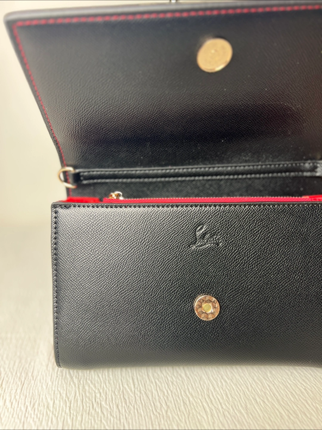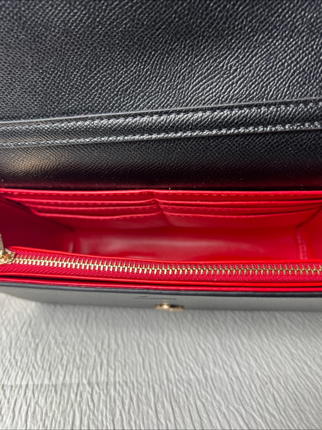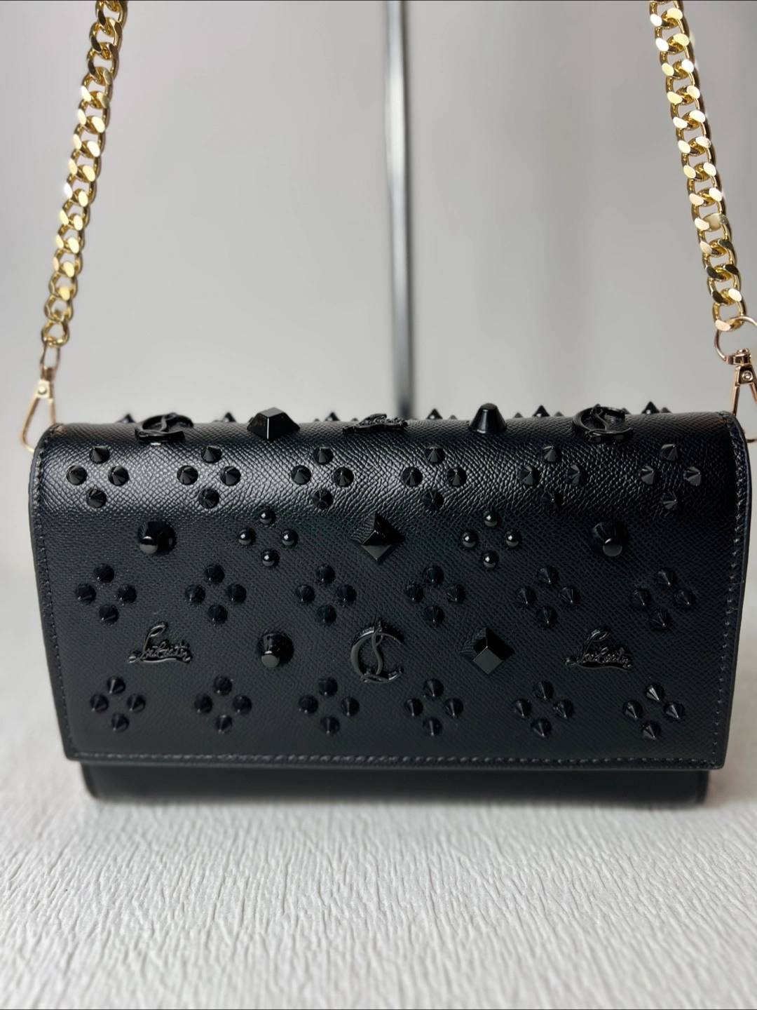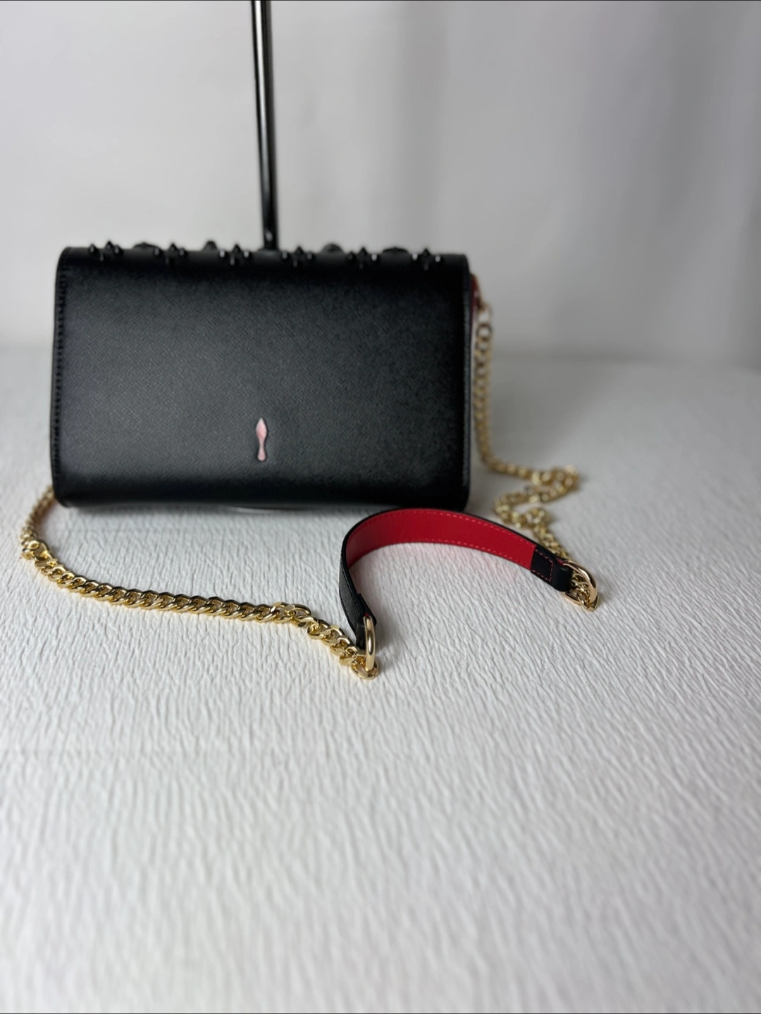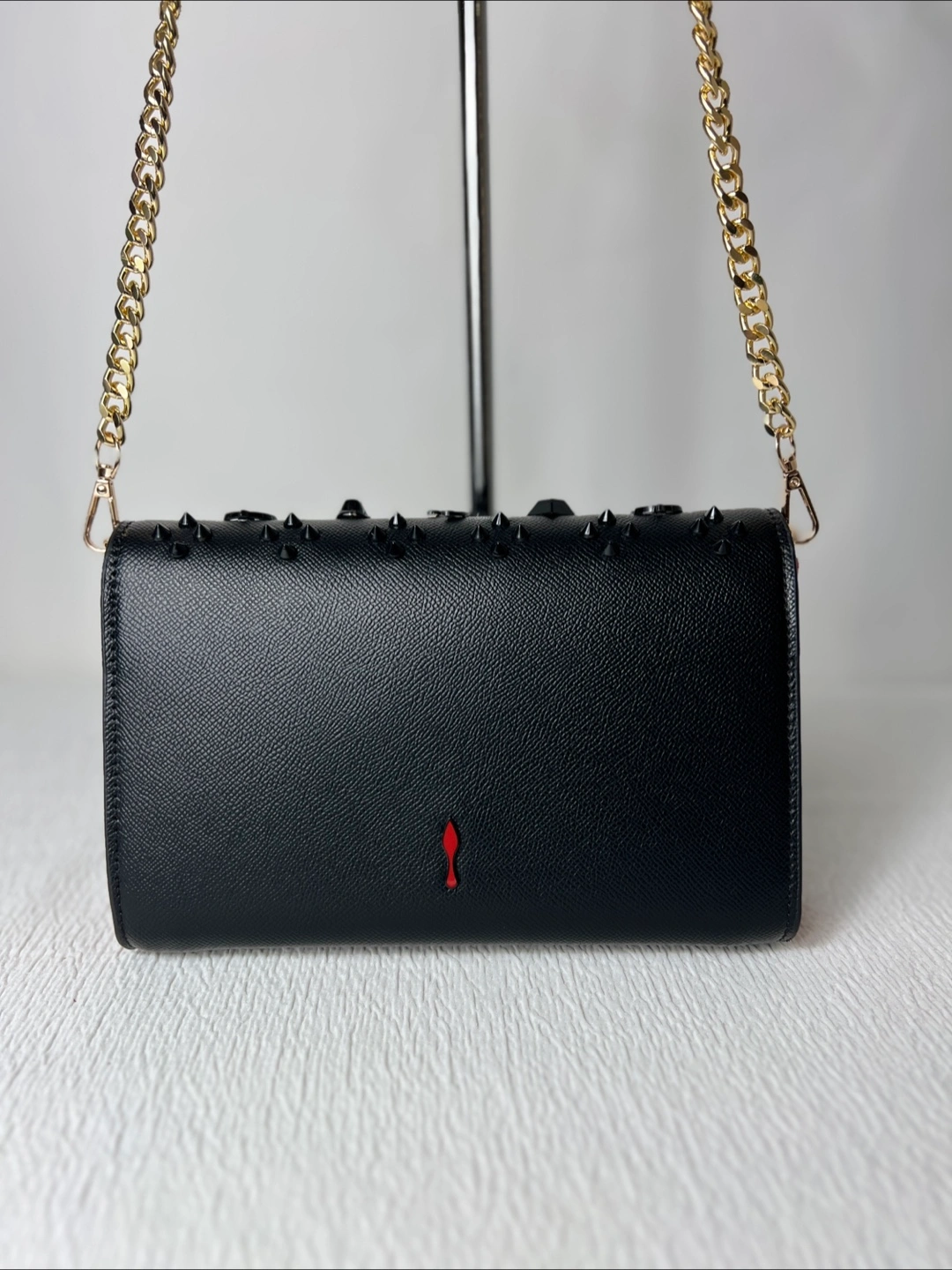 A black bag with a gold chain. Gold and black studs adorn the front. A red interior has multiple compartments. This bag would be perfect for a night out.