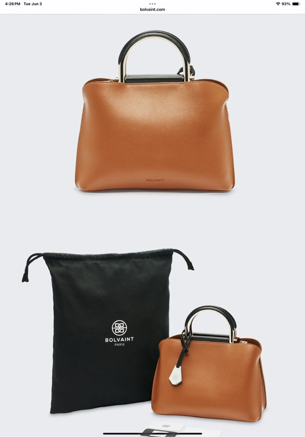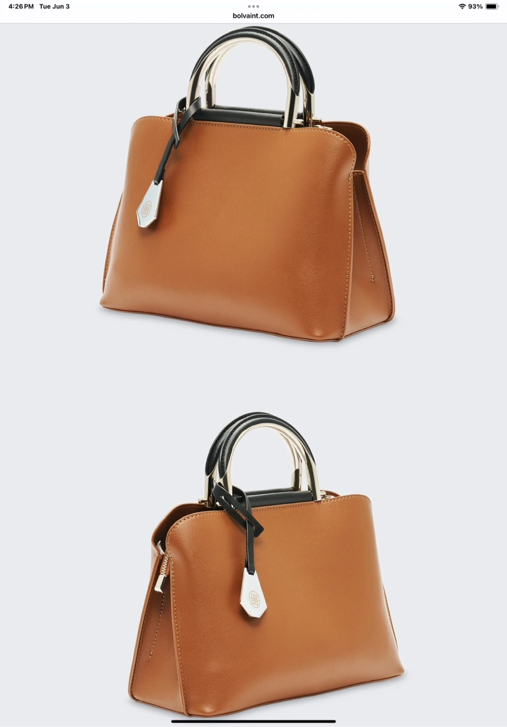 A brown tote bag. It has a black and silver handle. Also features a zipper and a small charm. This bag is perfect to store all your daily essentials.