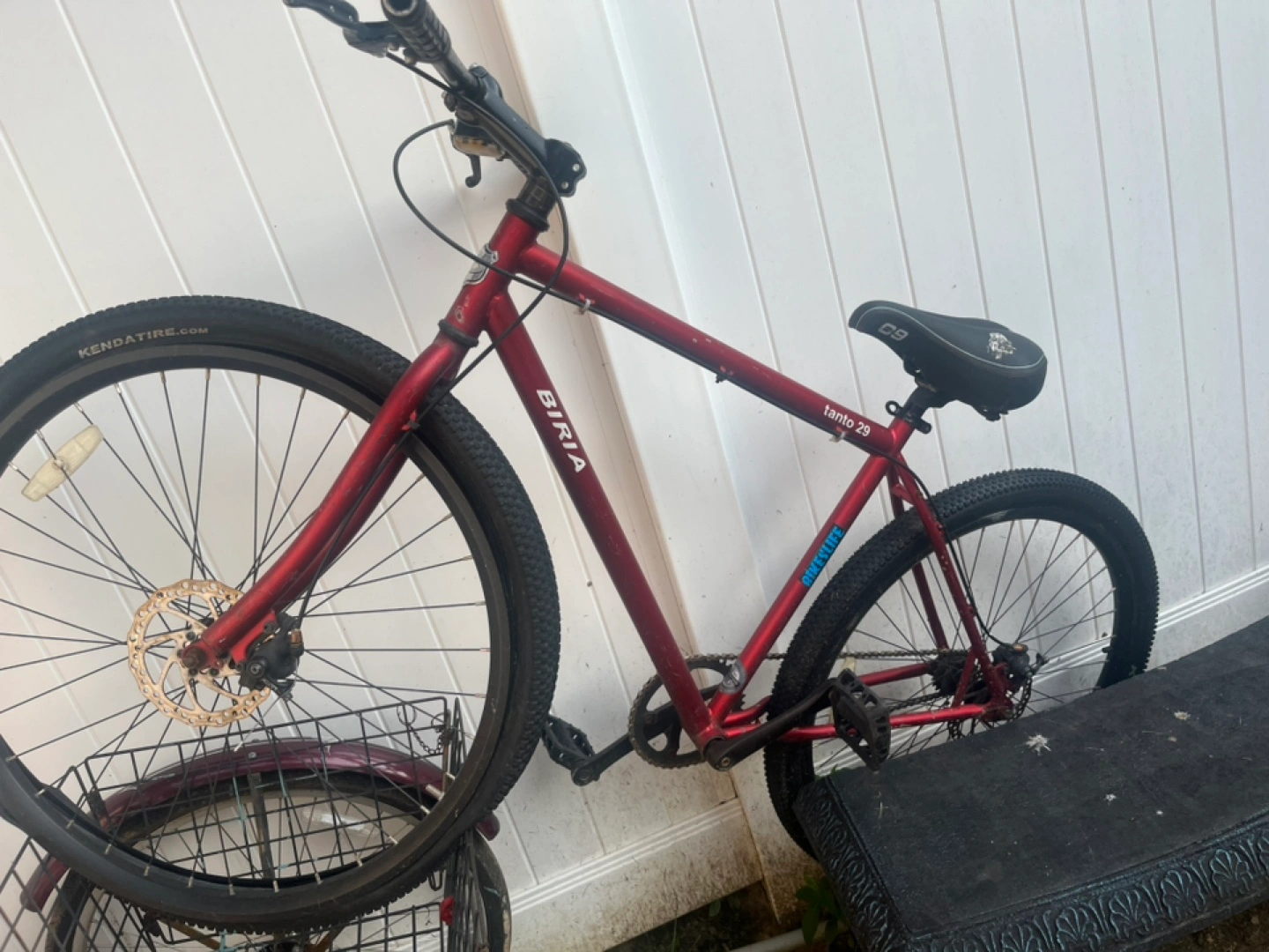 It features a red frame, and black tires. The front wheel includes a disc brake. This bike would be a great way to enjoy a relaxing ride through the neighborhood.