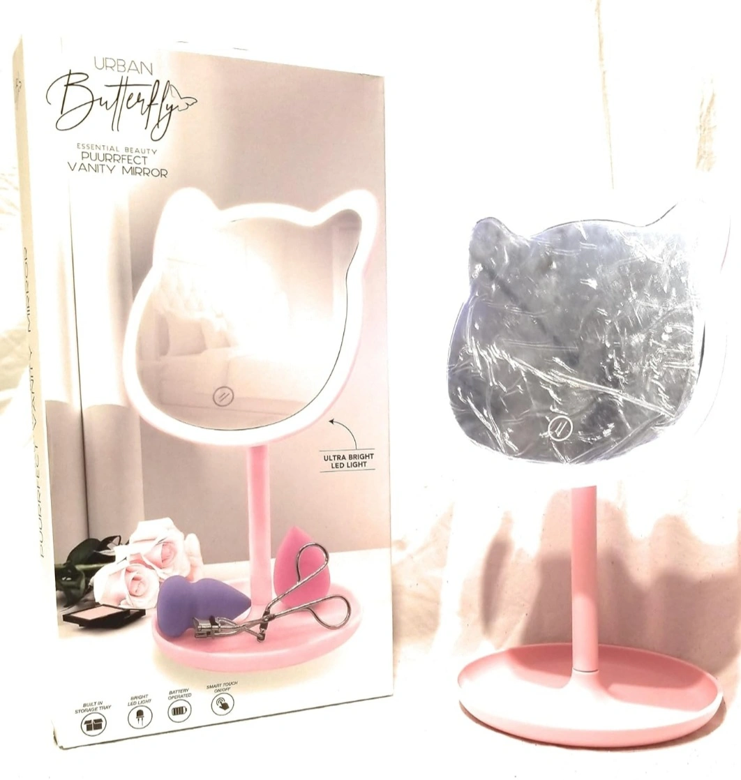 A cat-shaped vanity mirror. Bright LED light. Features a smart touch. The mirror is battery-operated. Perfect to make your makeup routine simple.