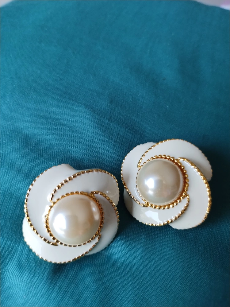 Clip-on earrings in a floral design. Features white enamel, a pearl in the centre, and gold accents. The back of the earrings have a clip-on mechanism. Pair these earrings with your favourite dress for a complete look.