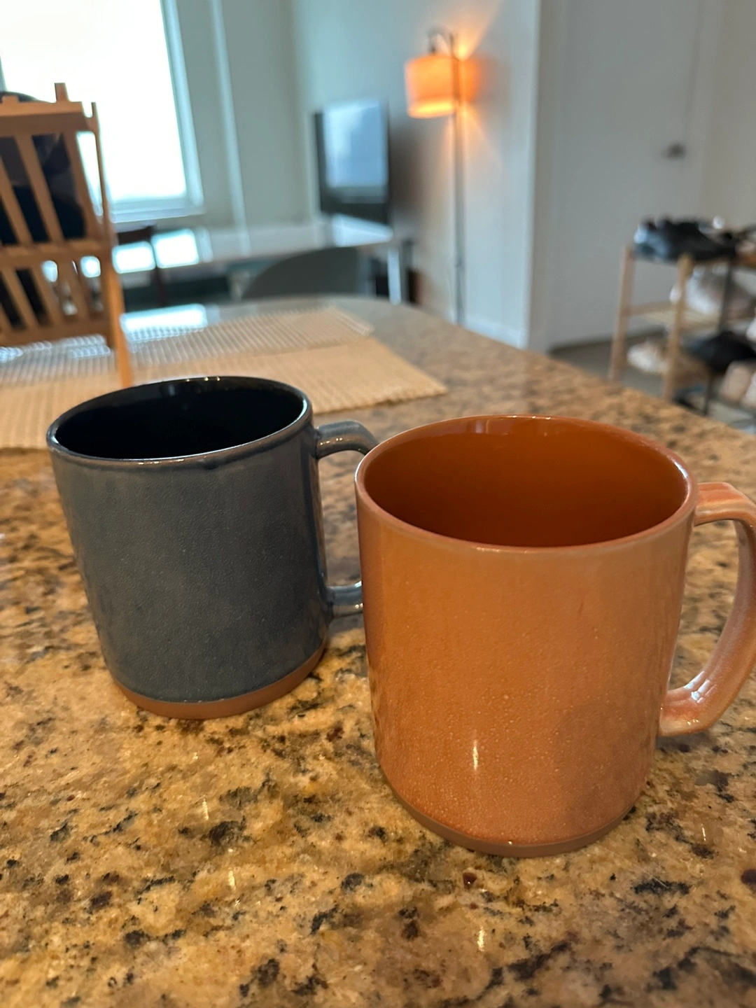 Beautiful ceramic mugs. One mug in a blue color and the other in a peach color. Perfect for a morning coffee or a cozy evening tea, these mugs offer comfort.