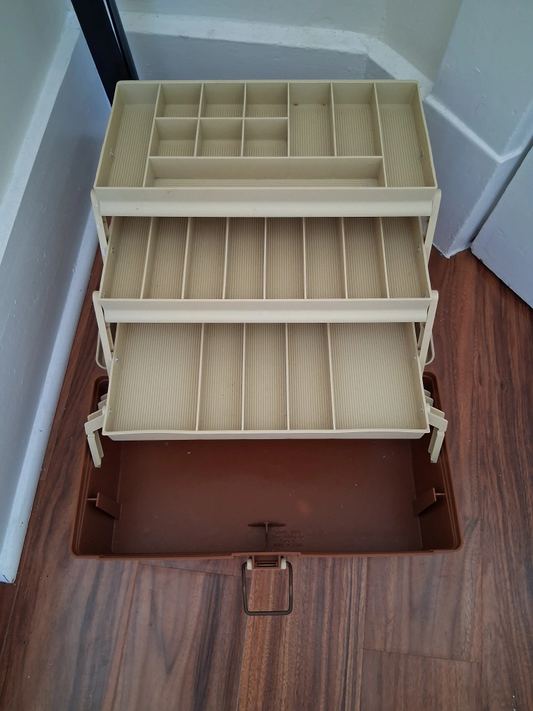 A vintage tackle box. Features multiple pull-out trays. The bottom has a large storage area. Could be a great way to relax and organize all your things.