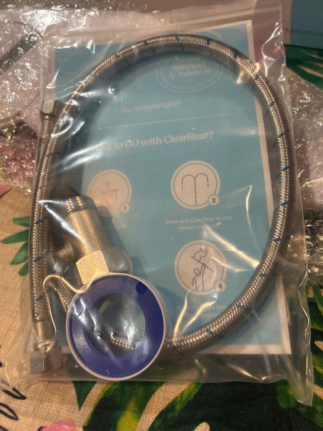 Here's a ClearRear bidet, packaged and ready to go. Includes components to attach to the toilet. A bidet can be a wonderful upgrade for your bathroom experience. It has never been used.