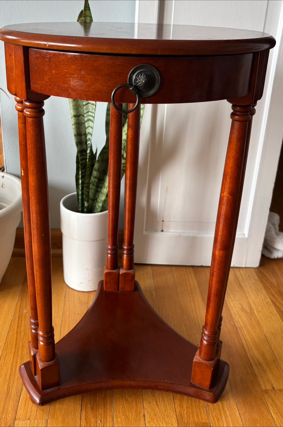 Selling a lovely wood end table! It features a drawer with a unique ring pull. The table has a classic design with a triangular base and round top. It's perfect for adding a touch of elegance to any room