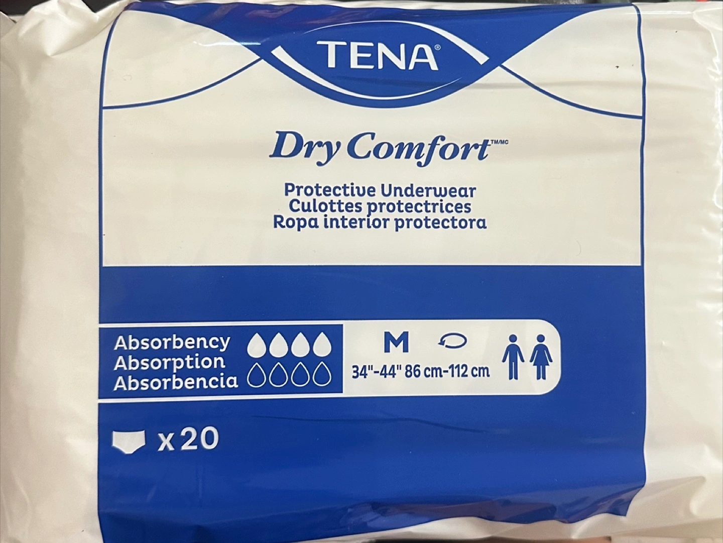 Package of protective underwear. It is size Medium. There are 20 pieces in the package. Putting these on can make you feel at peace.