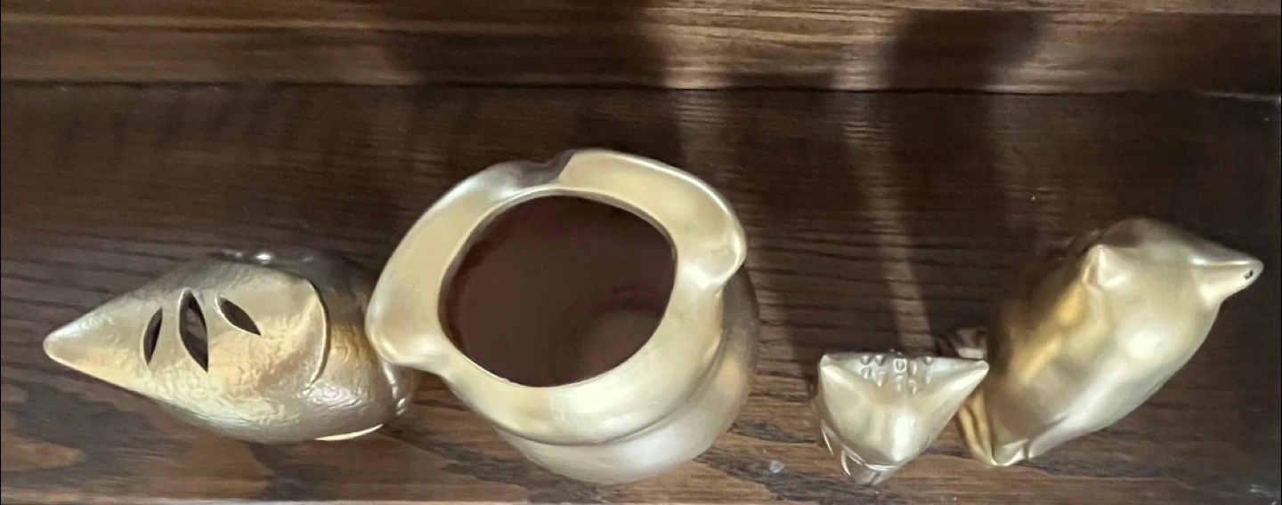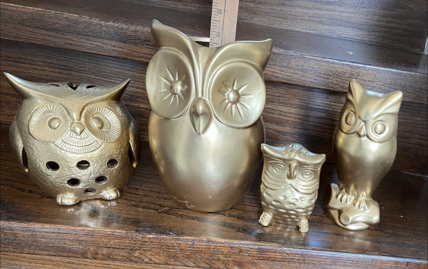 A collection of gold owl figurines. They appear in various sizes and poses. A beautiful set for any space. It could easily be used to bring a sense of peace and calmness into a room.
