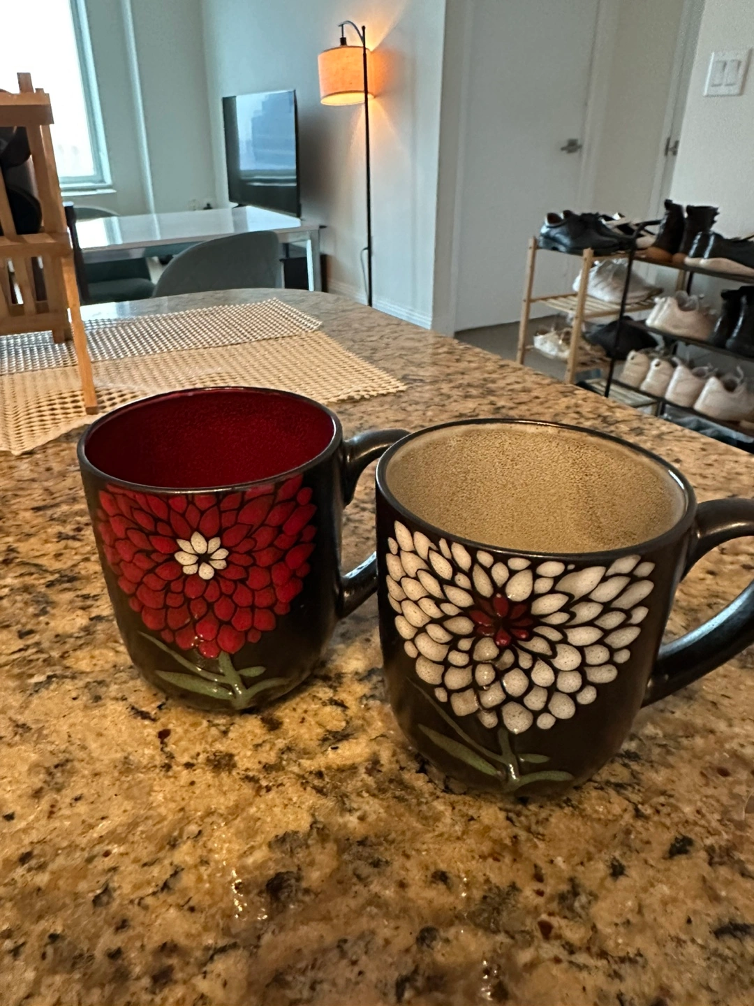 Beautiful mugs with floral patterns. Each mug has a handle. A perfect mug for morning coffee, or a cup of tea before bed.