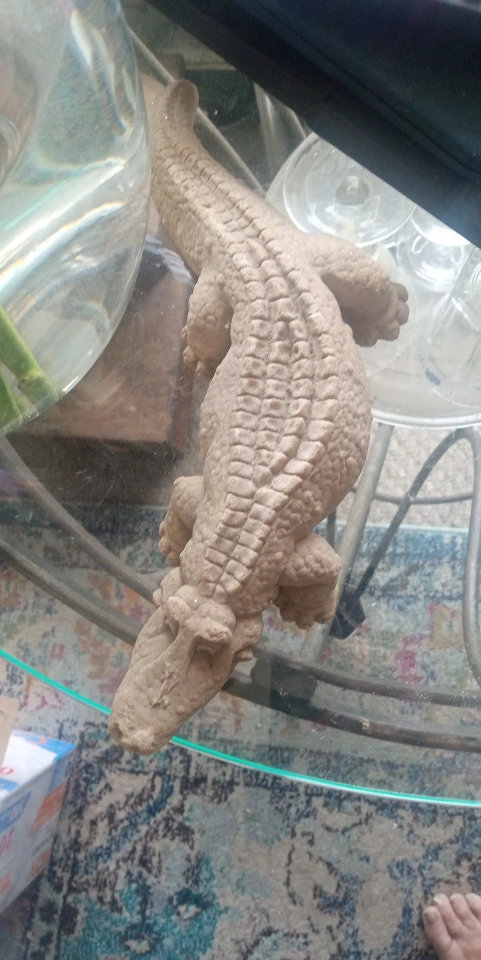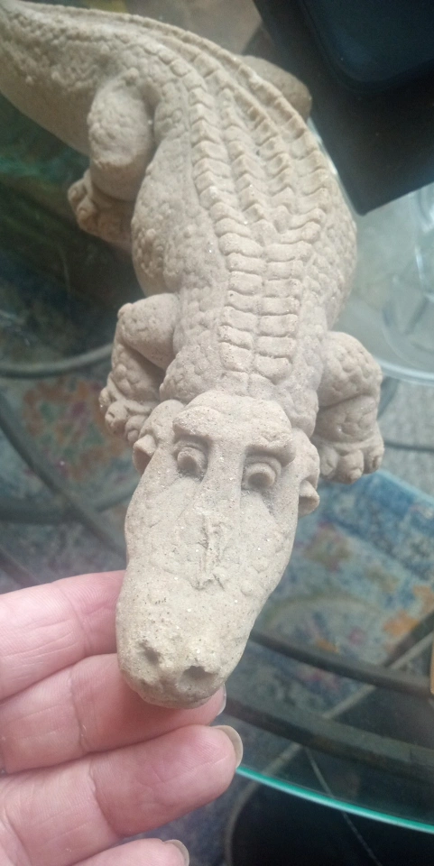 584A detailed alligator figurine. Looks to be made of a stone-like material. Would make a lovely piece for any shelf or desk in your house.