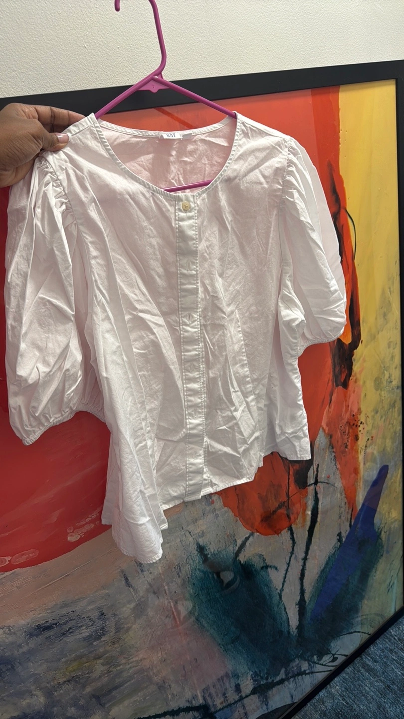 White button up blouse. Features short puffy sleeves. Perfect to wear on a relaxing walk.