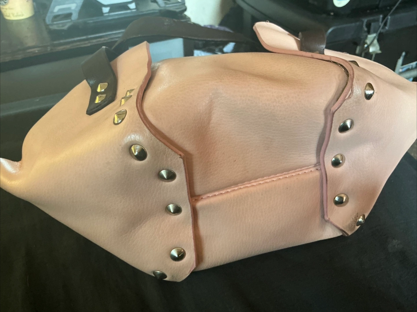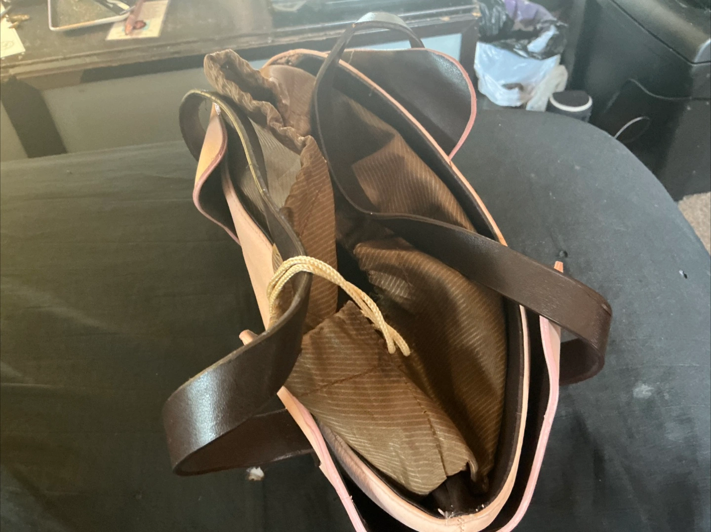 65Light pink purse with brown straps. Studs lining the side seams. Interior has brown lining with a drawstring closure. A perfect way to stay organized on your busy days.