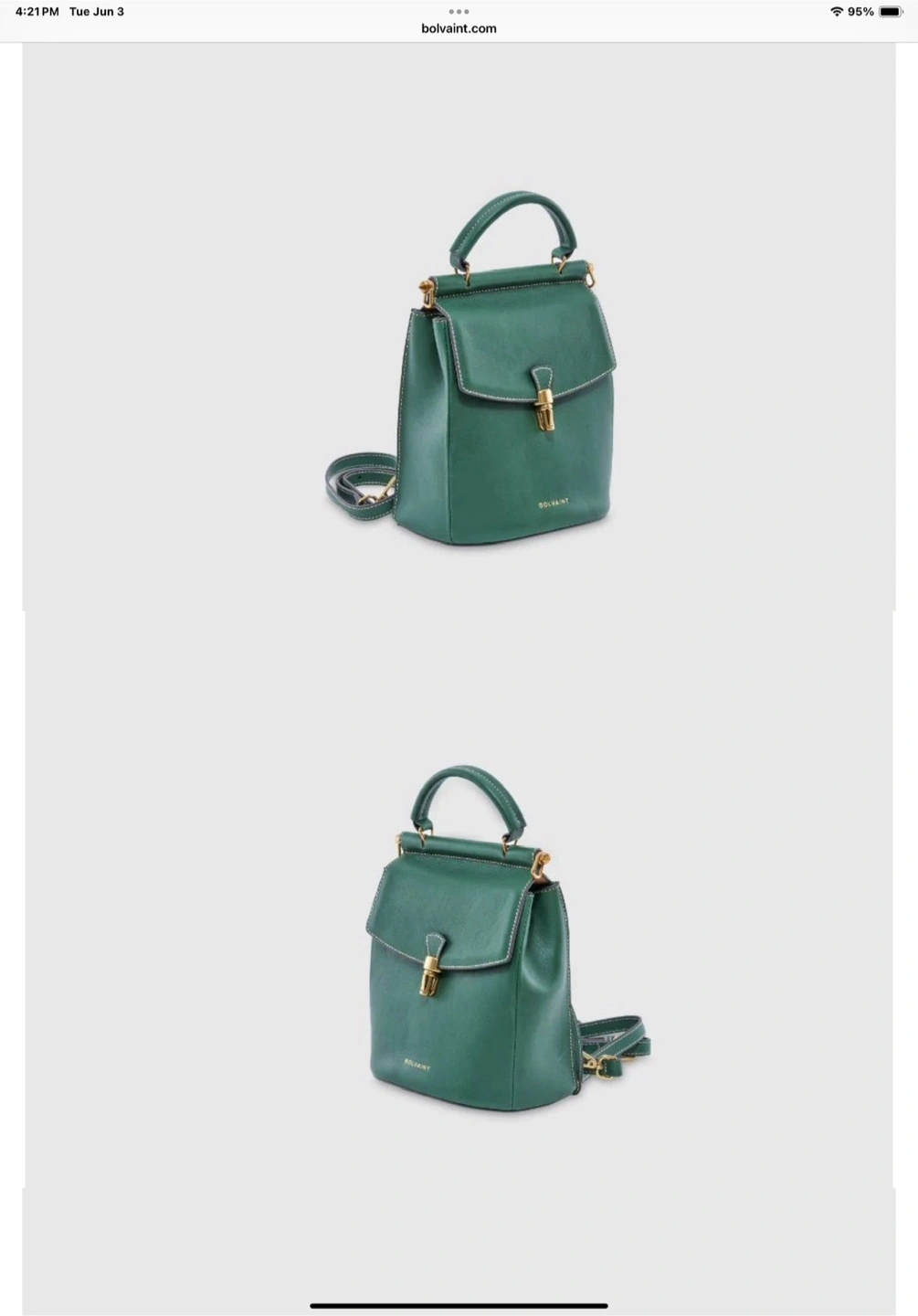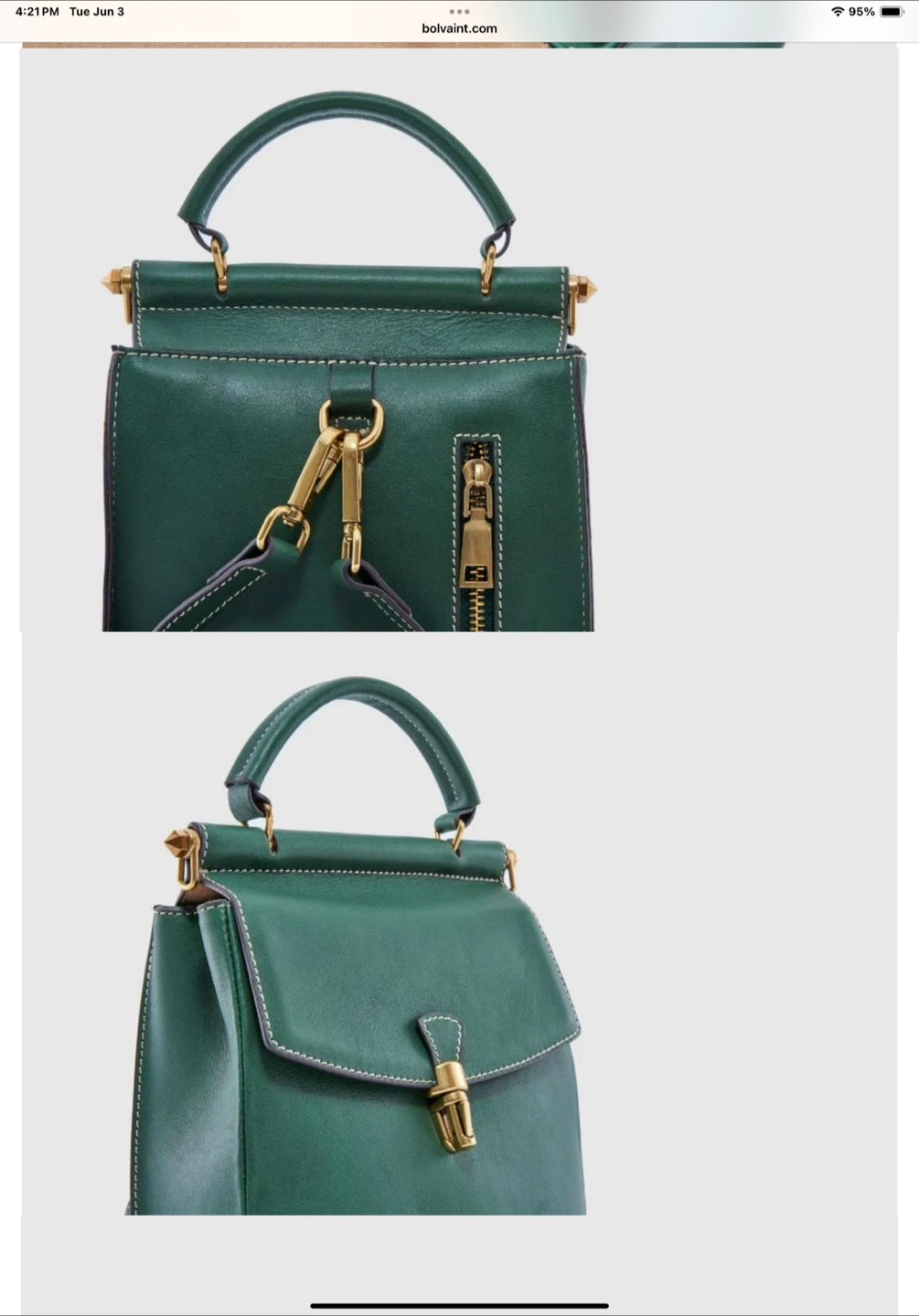 A gorgeous green bag. It has a handle, a strap, and multiple compartments. The hardware is gold. The bag can be used daily, providing a sense of peace.