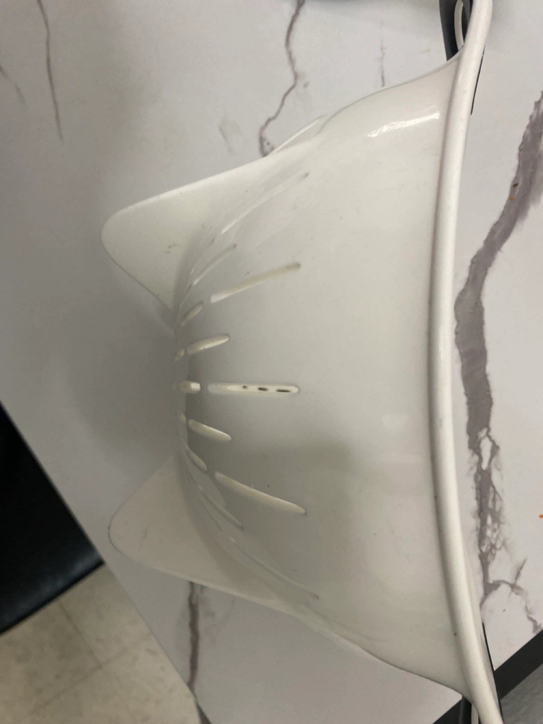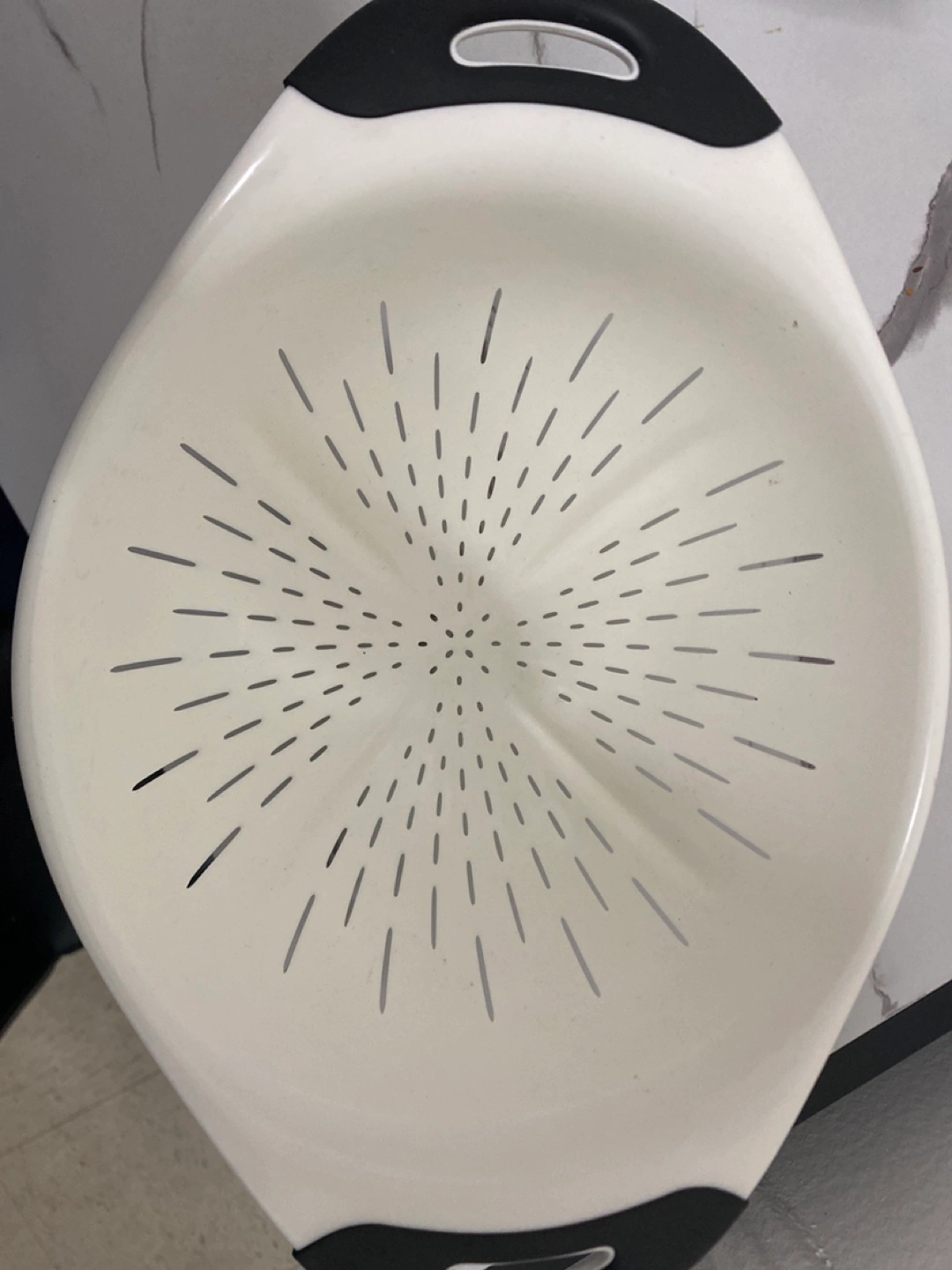 A white colander. Features black handles and a white interior. It would be wonderful to use to rinse some fresh berries before putting them in a bowl.