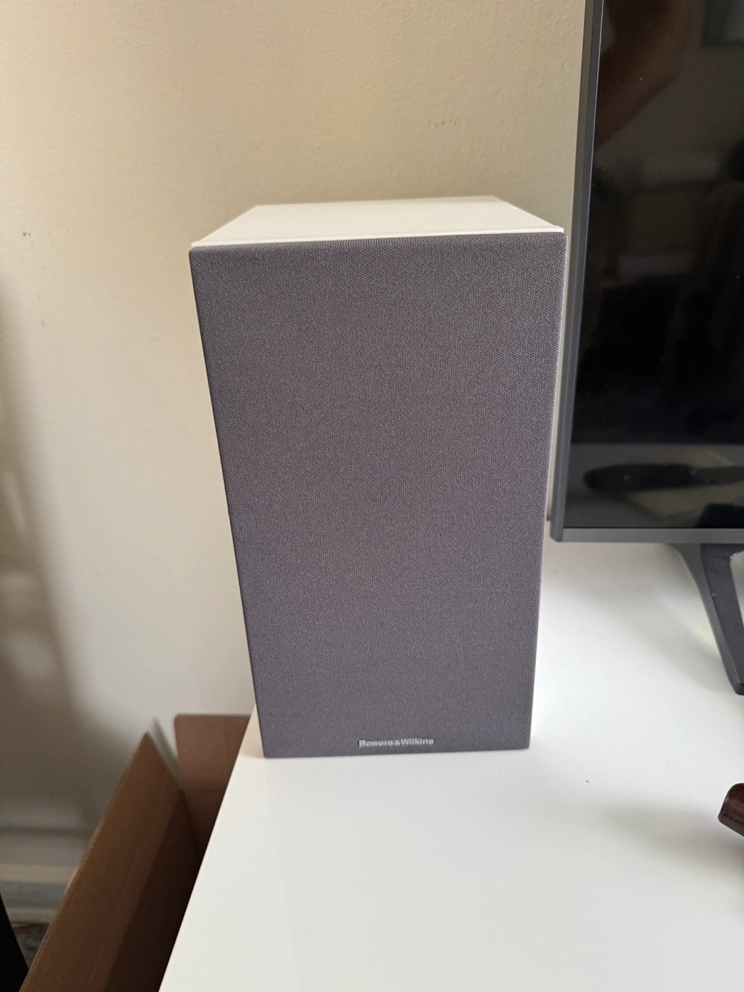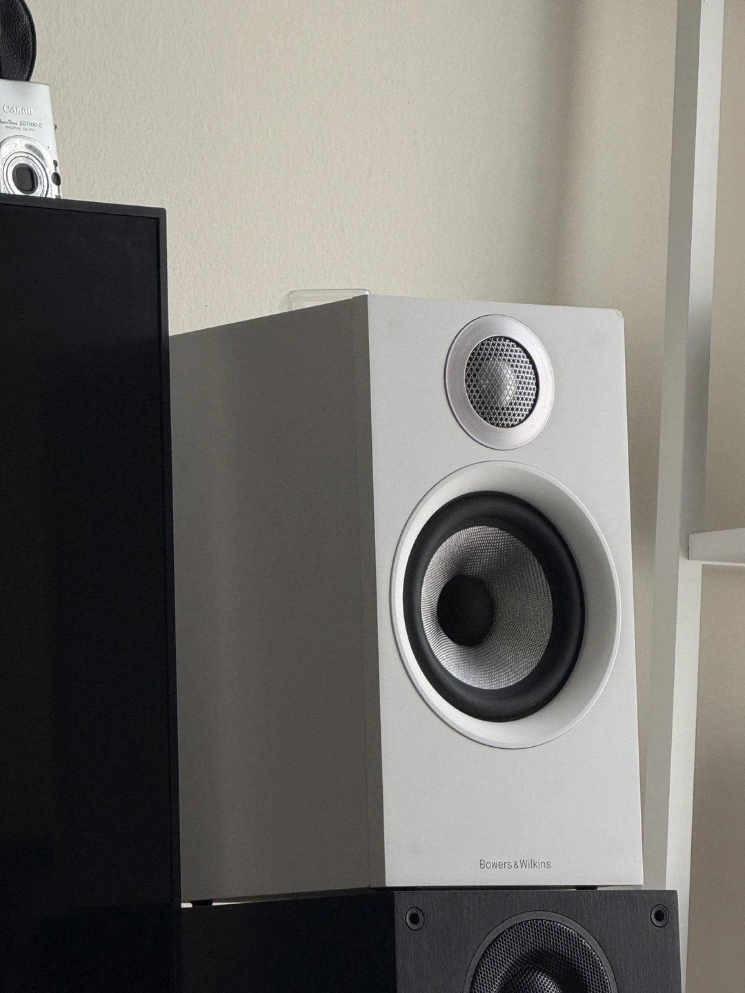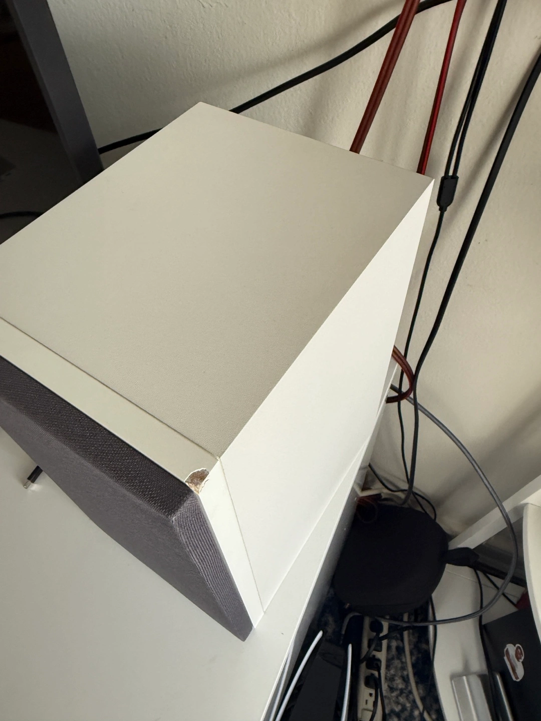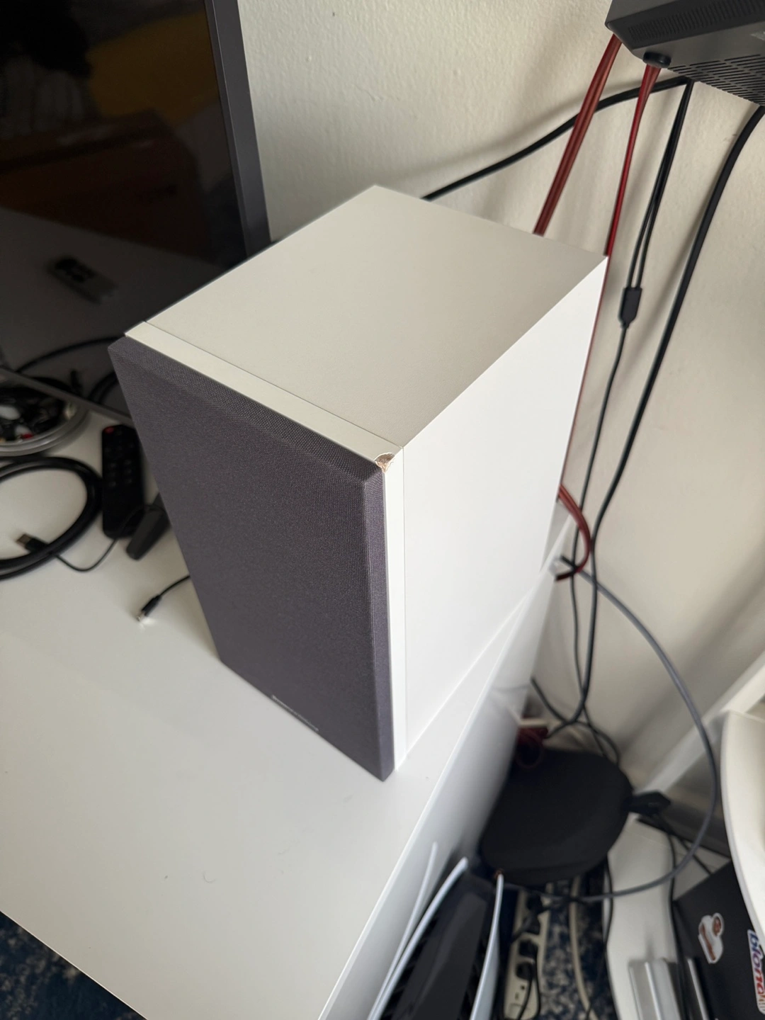 93White rectangular shape. Features a grey speaker cover. Has a circular silver grill. You can use it to listen to your favorite music and relax after a long day.