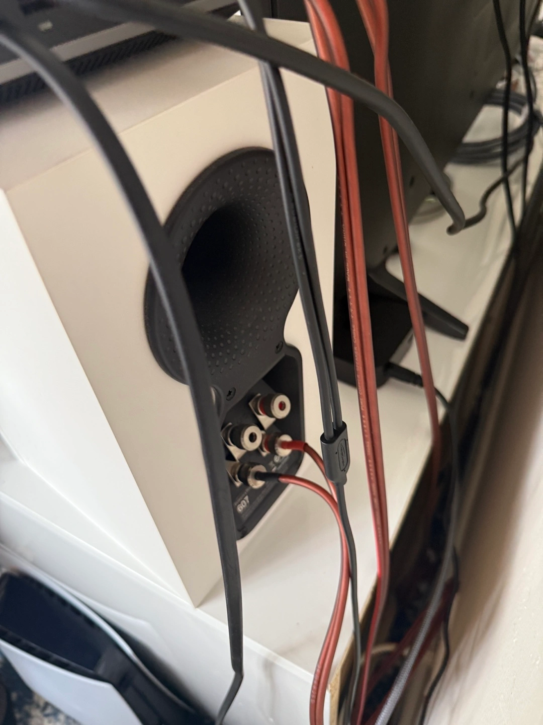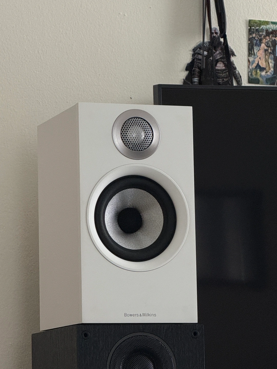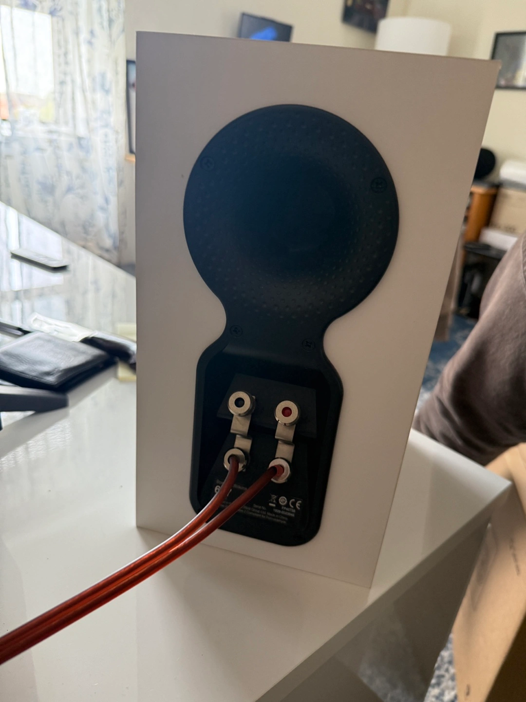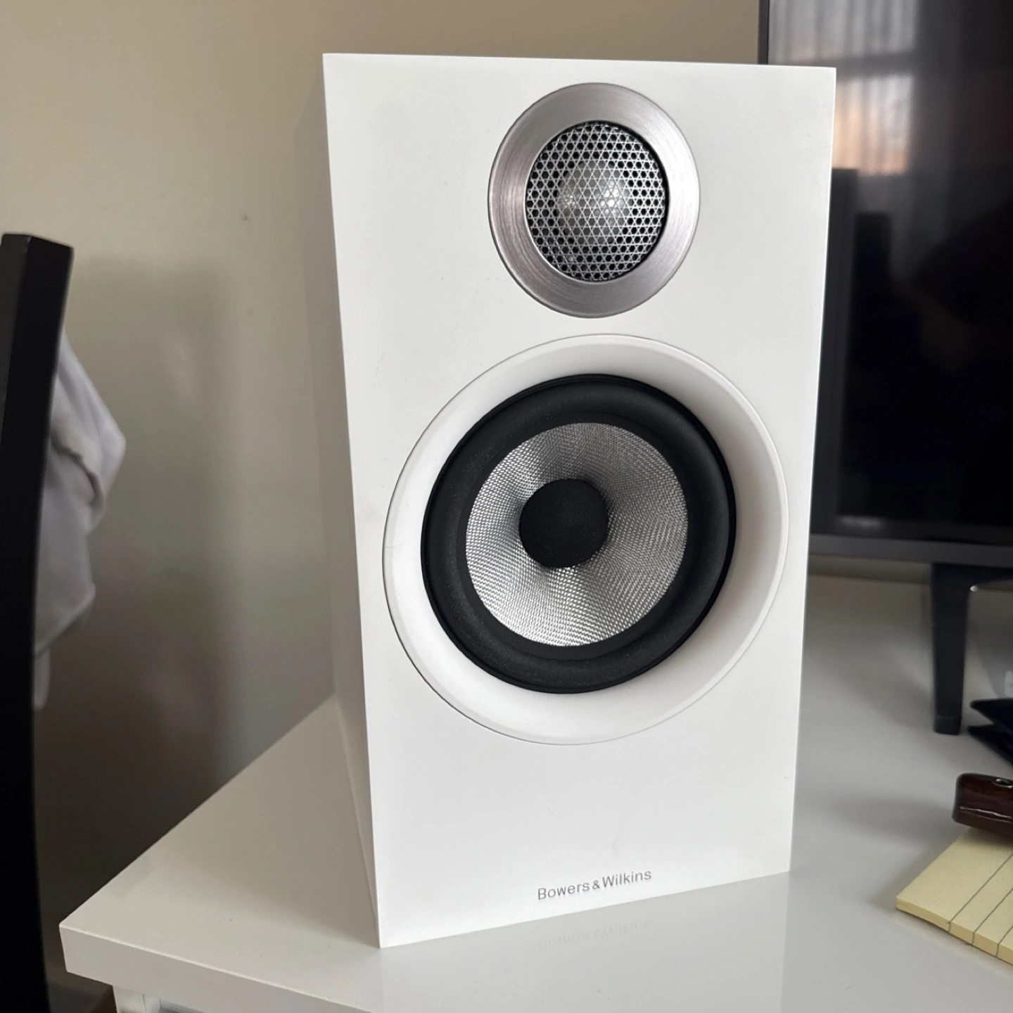 93White rectangular shape. Features a grey speaker cover. Has a circular silver grill. You can use it to listen to your favorite music and relax after a long day.
