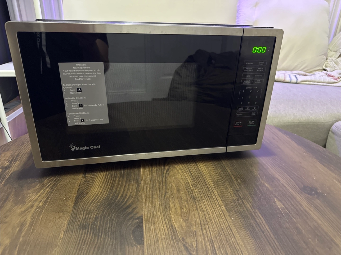 A microwave oven with digital display. Control panel with buttons for various cooking functions. The item is in excellent condition, perfect for reheating leftovers after a long day.