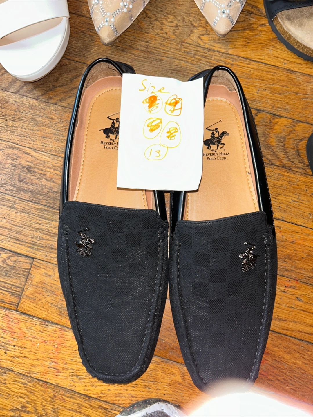 234Black loafers. They have a checkered pattern. Great for adding a touch of style to any outfit.