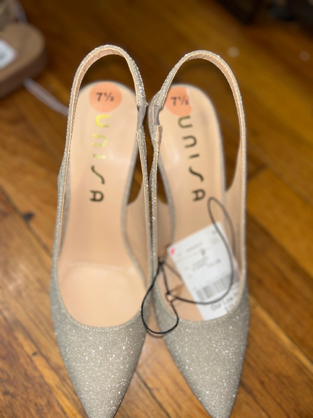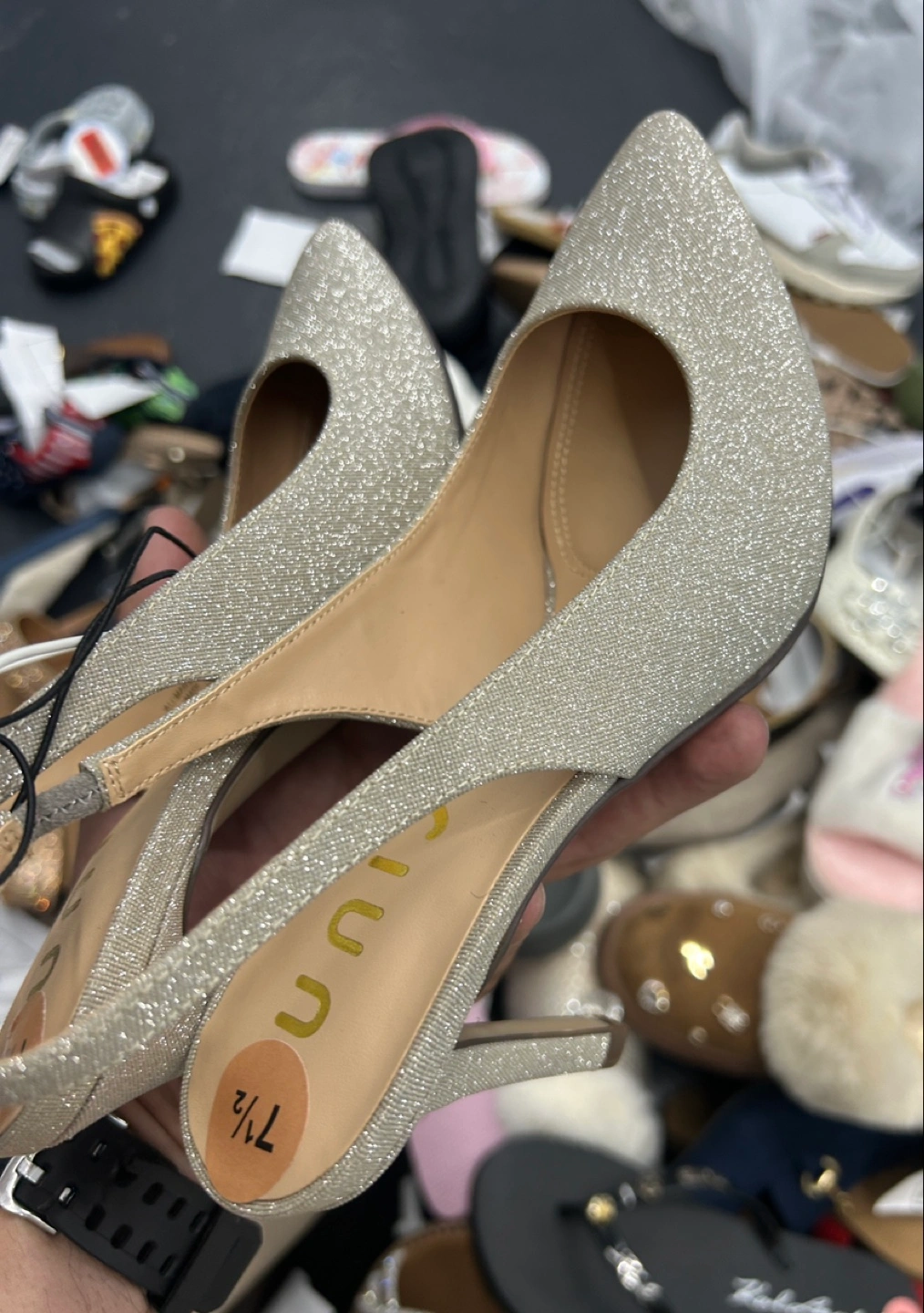 234Sparkly heels featuring a pointed toe and slingback style. Marked with a size 7.5. The perfect shoe to wear while you take a leisurely walk.