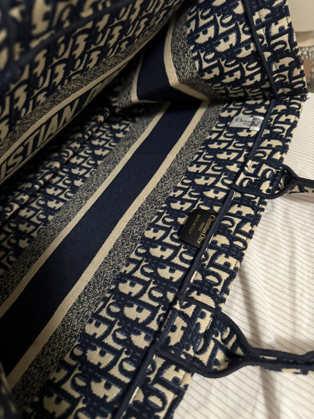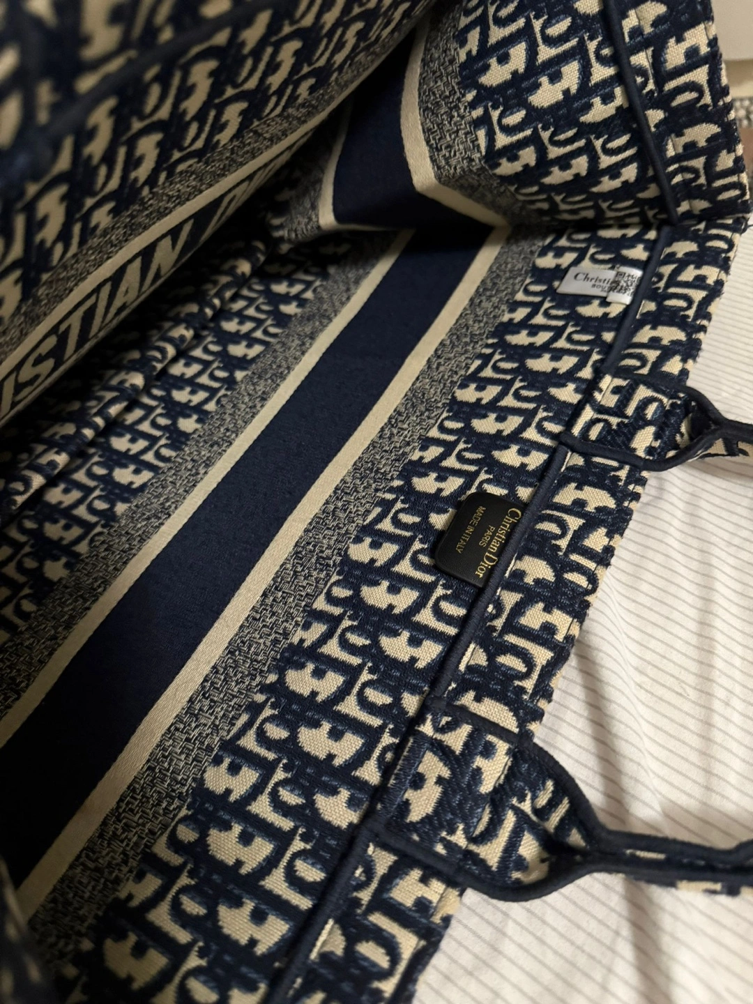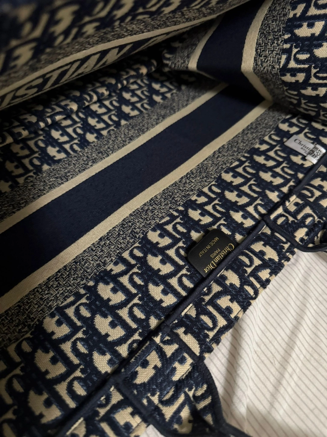 60A classic tote bag. Features a navy blue and beige print. The bag has handles. Easily bring your favorite items along for your daily travels, and enjoy a sense of serenity.
