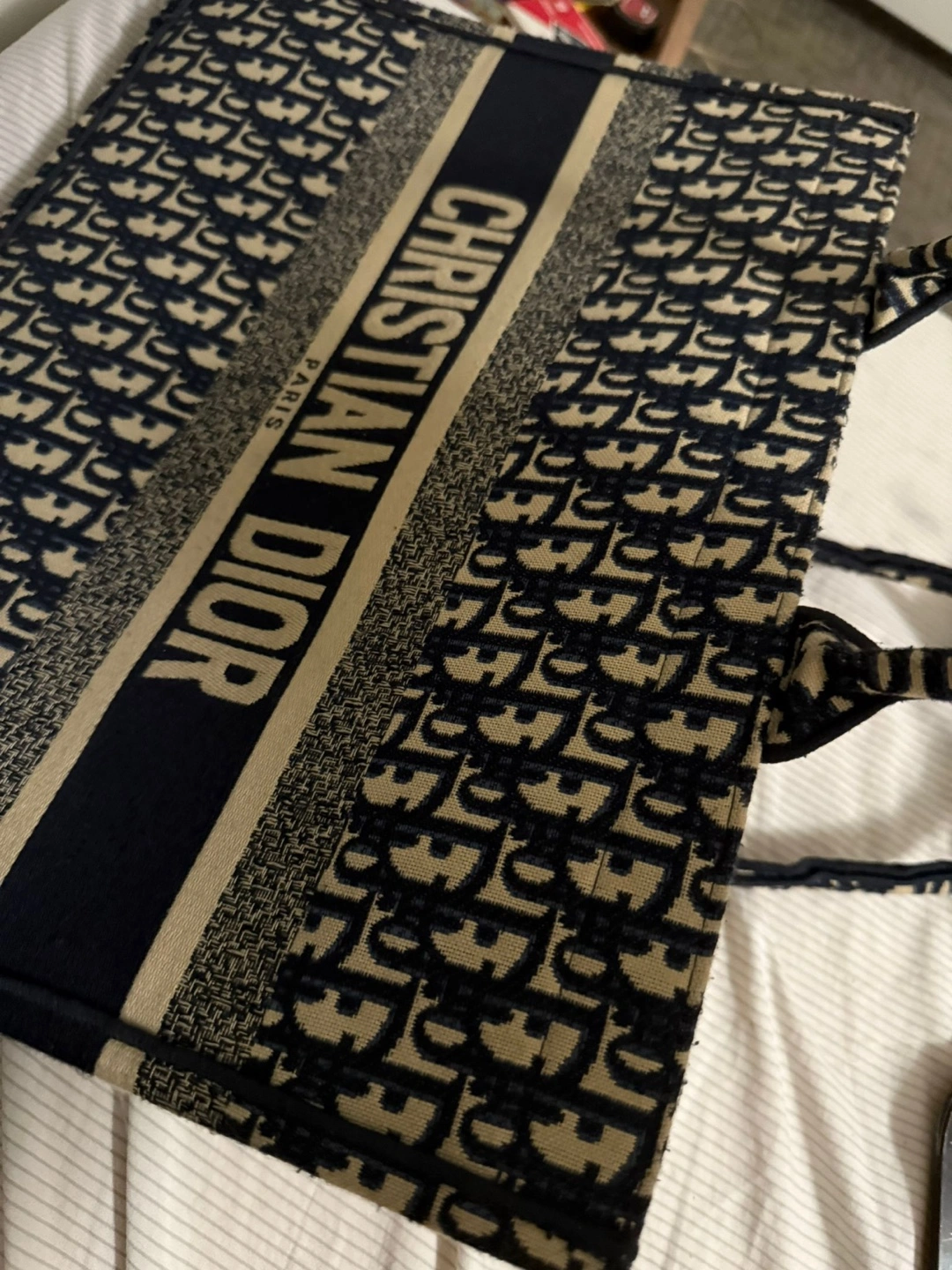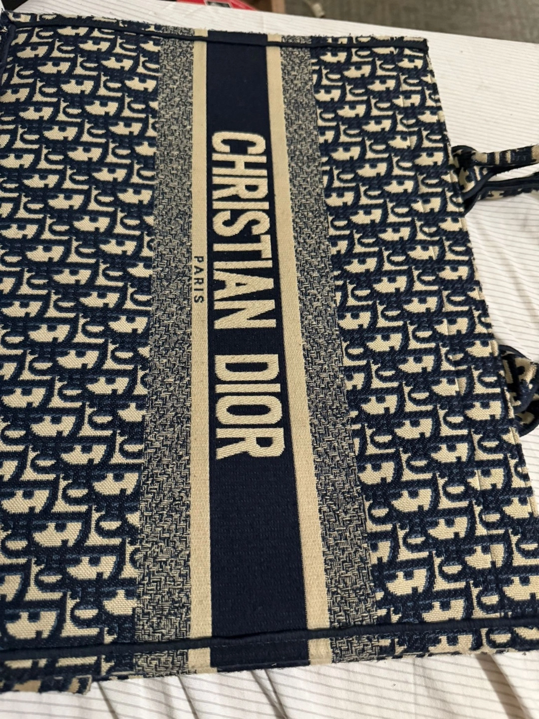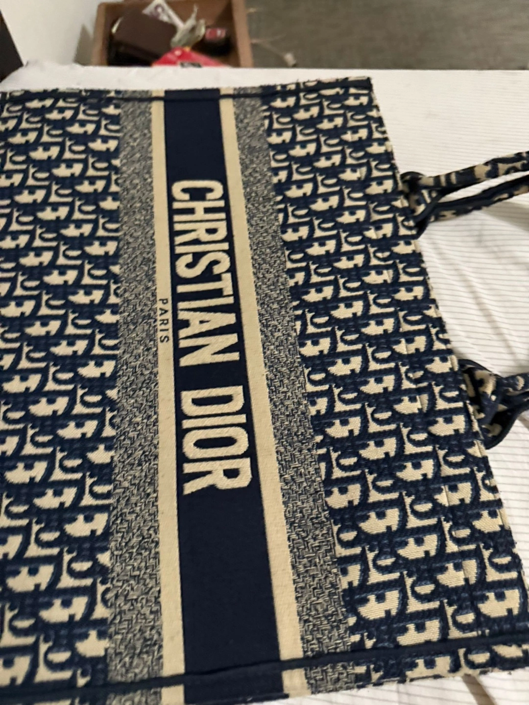 60A classic tote bag. Features a navy blue and beige print. The bag has handles. Easily bring your favorite items along for your daily travels, and enjoy a sense of serenity.