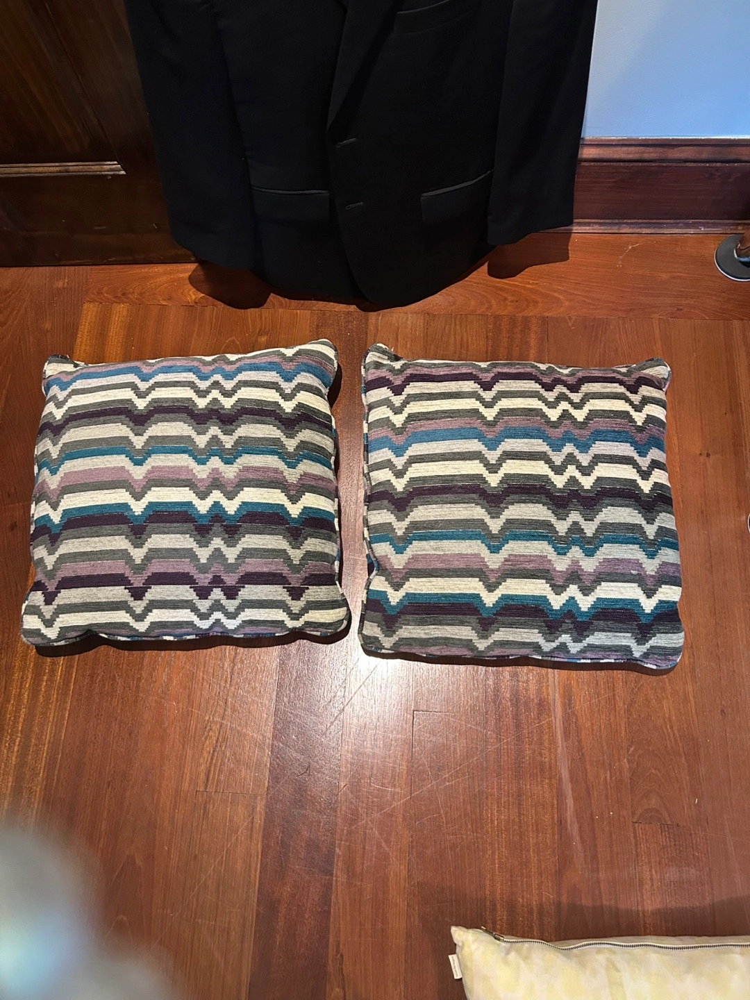 Patterned throw pillows. Feature a vibrant, geometric design. Soft chenille. Decorative and modern. Sold as a pair. This came with a sofa, but never were used. Pretty colors, just not my decor.