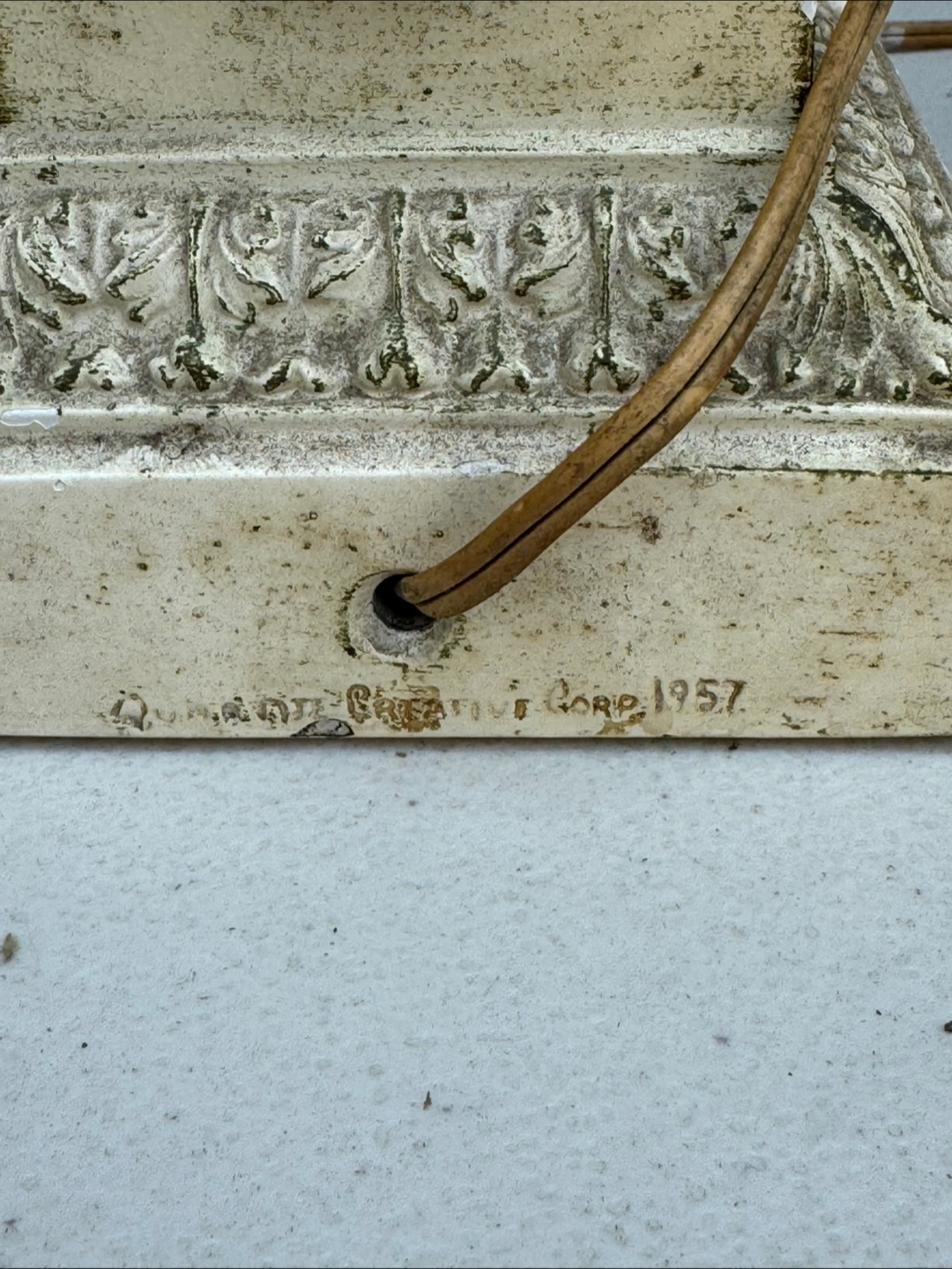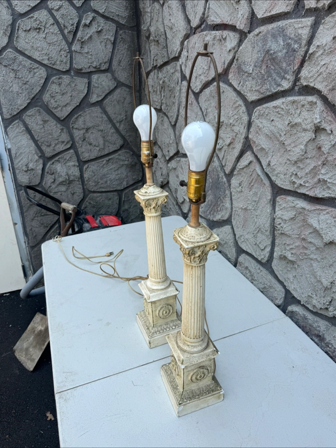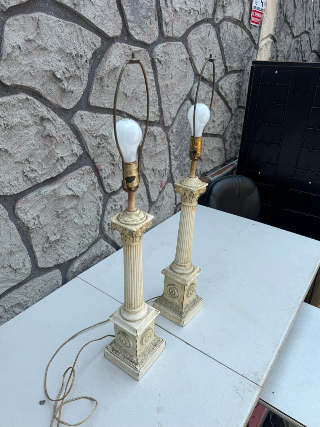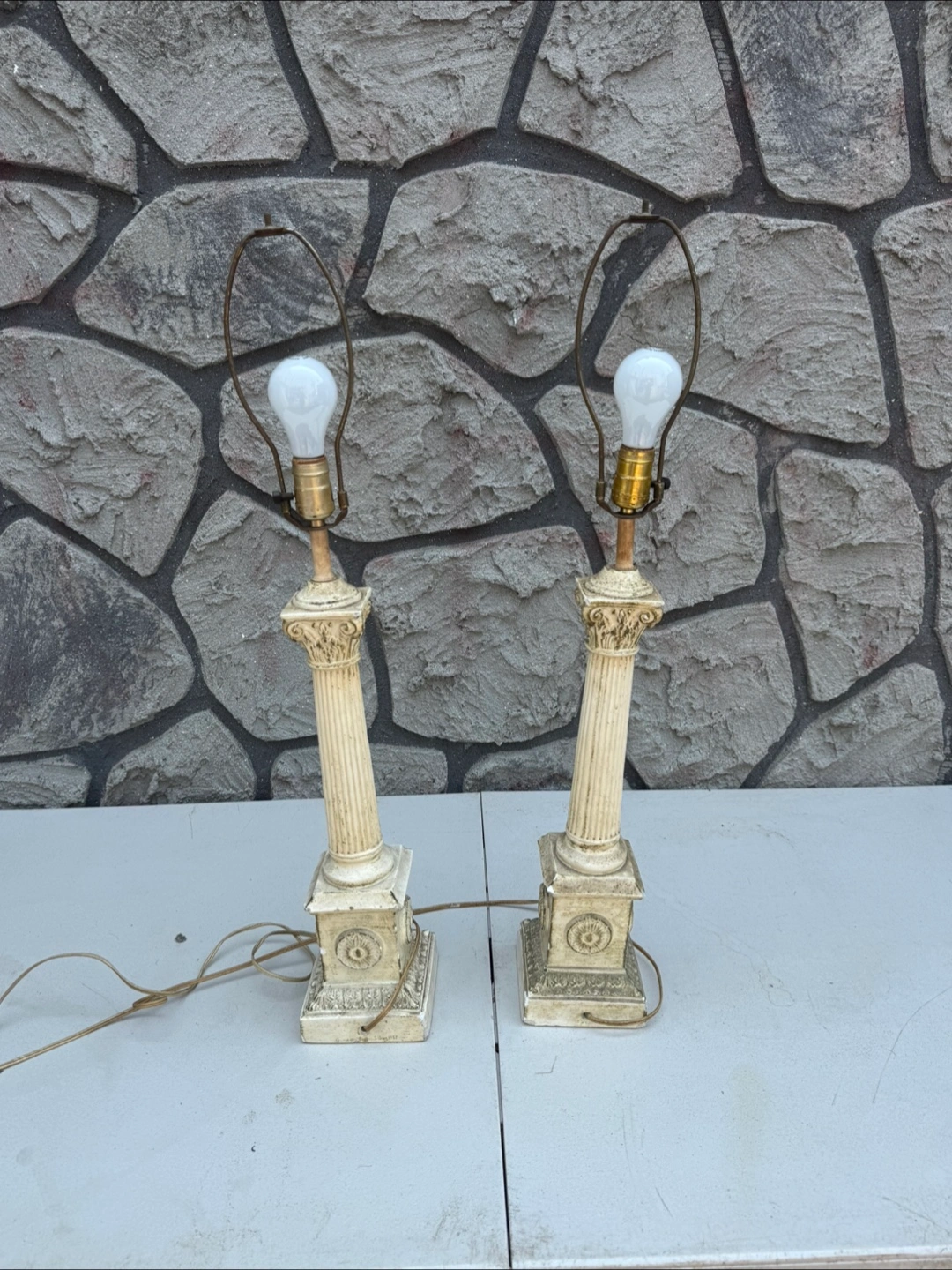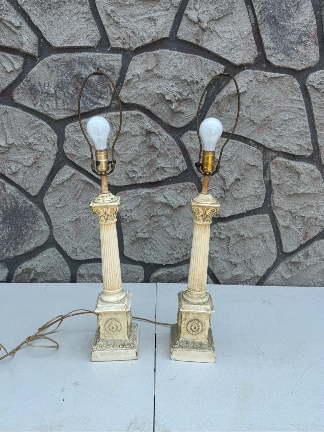 89Matching set of lamps, featuring a column-like design. There is ornate detailing and a rectangular base. Marking at the base says 1957 Base is 5.25” x 5.25” 32” tall In good working condition