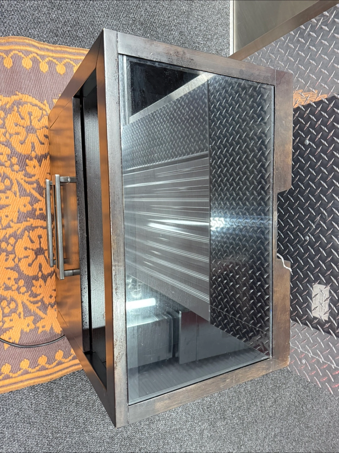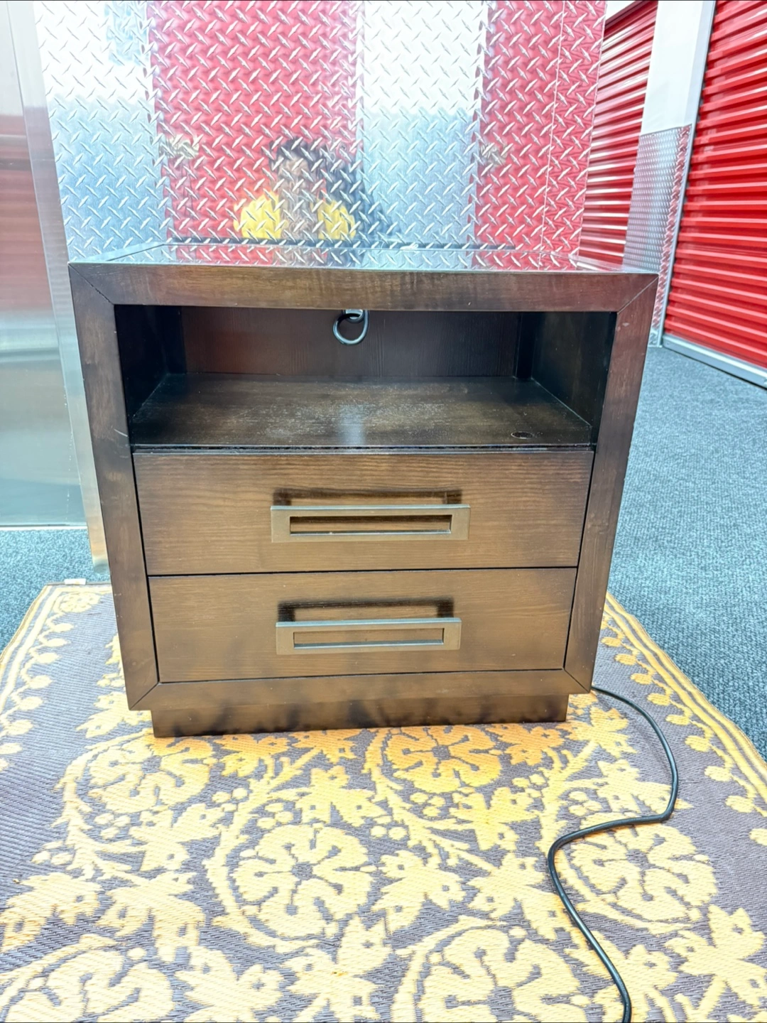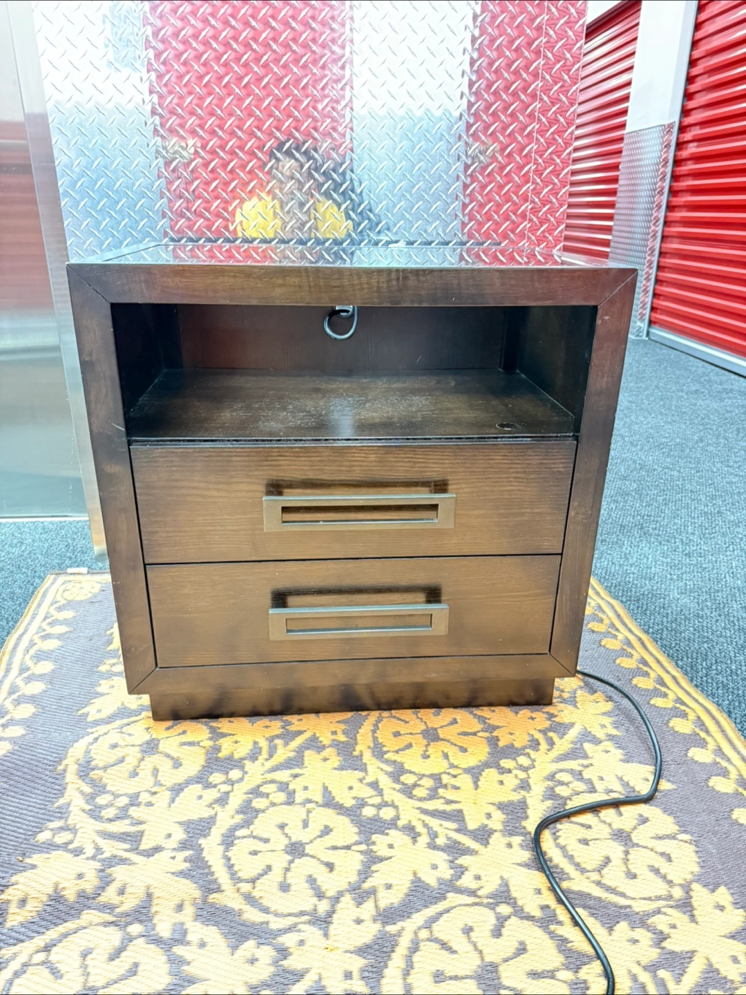 165A nightstand with two drawers and an open shelf above. It has a dark wood finish, and metal handles on the drawers. The top is a glass surface, perfect for setting down your nighttime beverage.