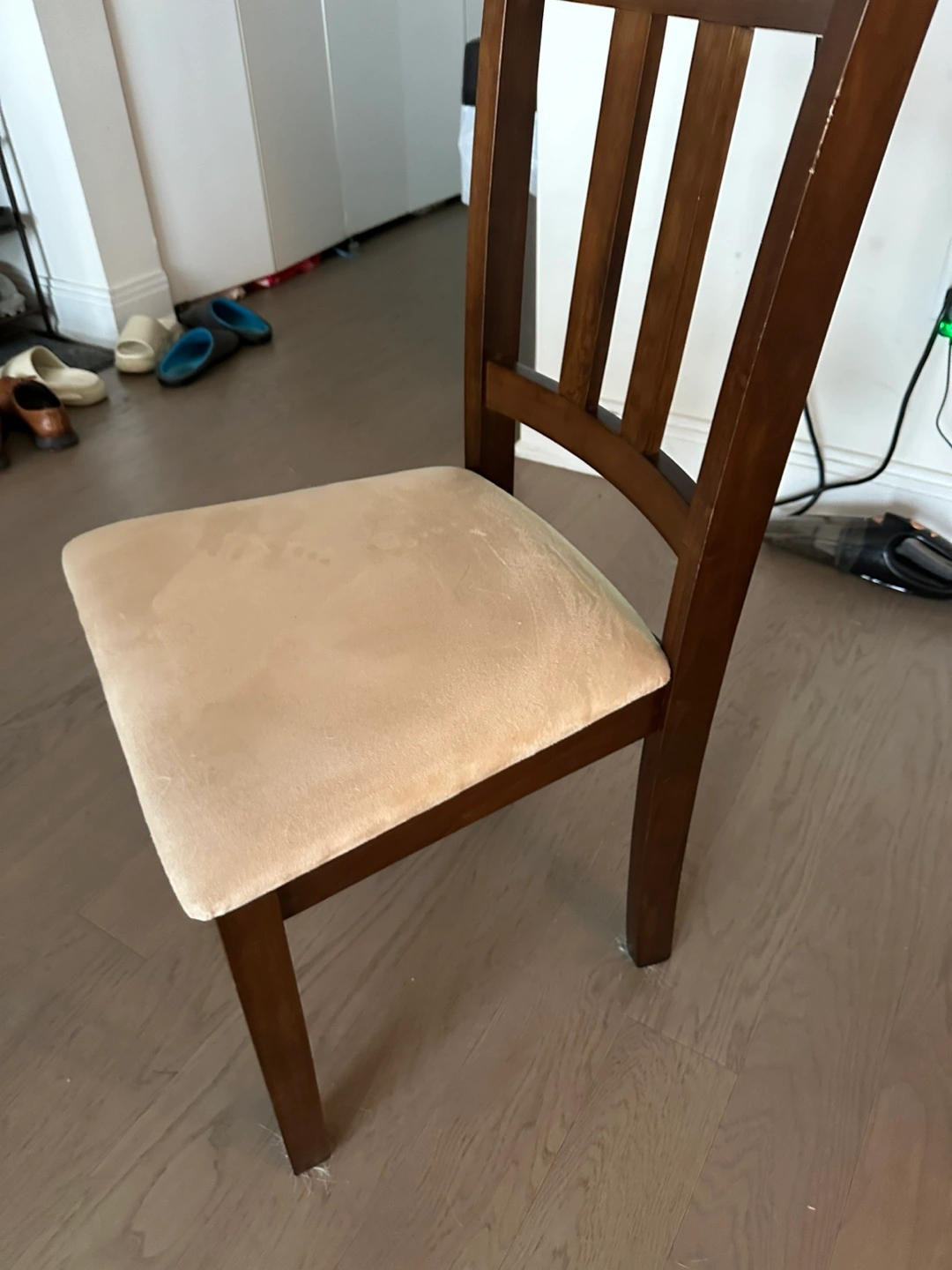 A sturdy wooden chair. Features a padded seat. The back has vertical slats. It's perfect for relaxing and enjoying your morning coffee.