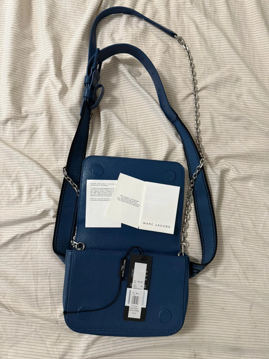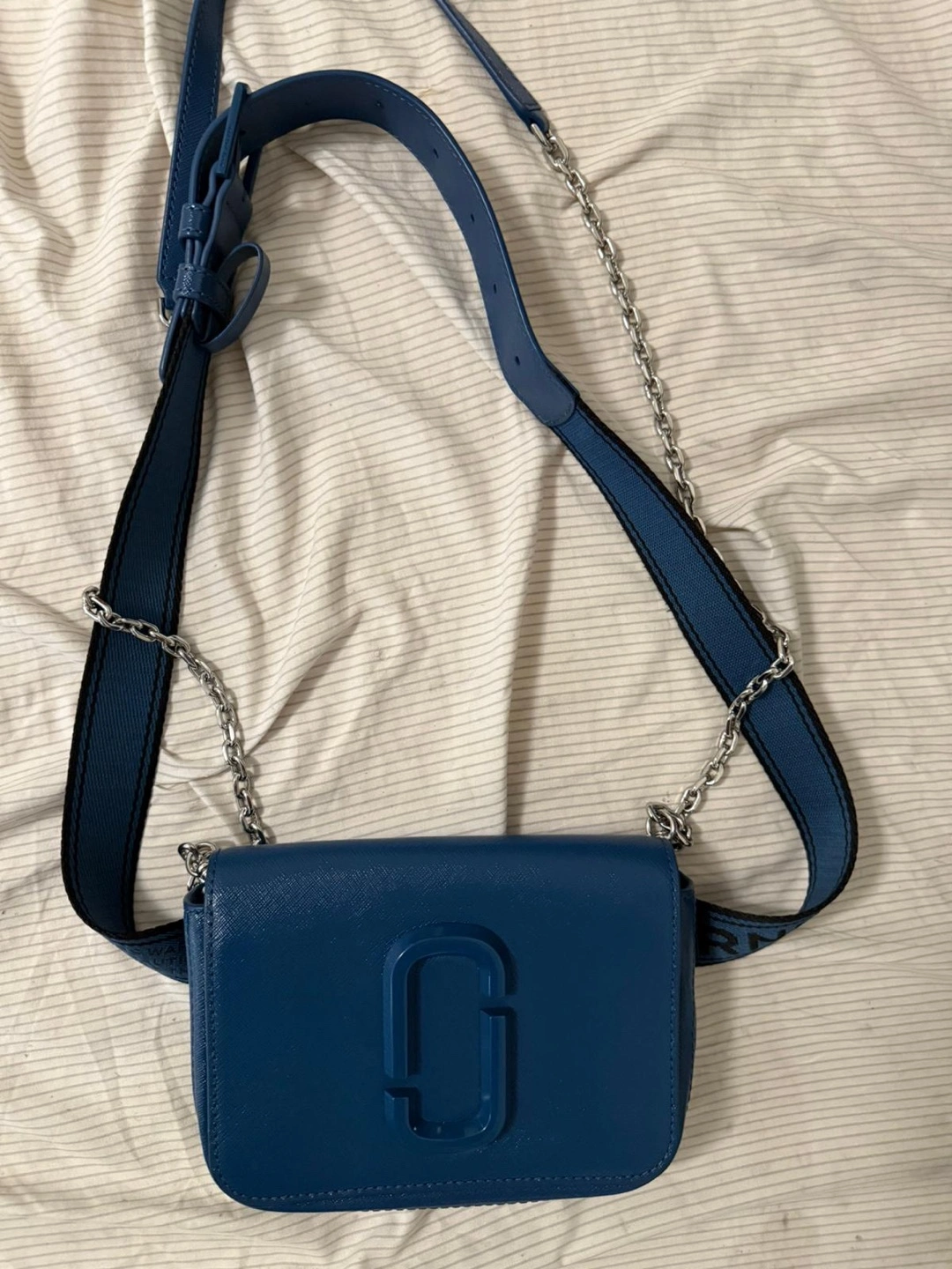 60A blue crossbody bag with an adjustable strap and a silver chain. It has a flap closure, and an interior pocket. A beautiful bag to carry your belongings and enjoy a relaxing afternoon. Authentic