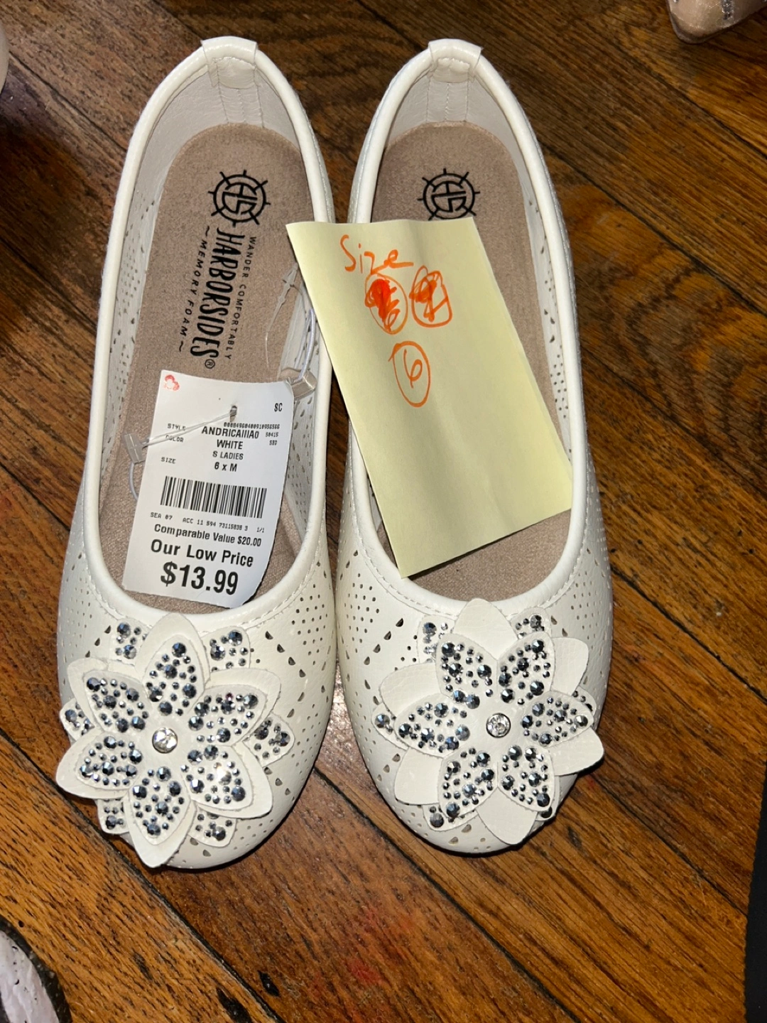 White shoes with a flower on the toe. Features a perforated design. Great for special occasions. Size 6