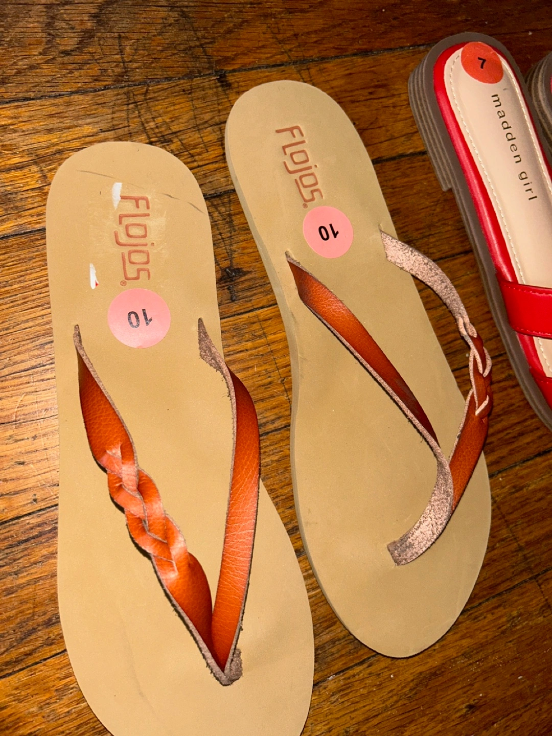 234Flip flops with brown straps, one of the straps features a braided detail. The sandals have a nude base. Slip these on for a relaxing day. Size 10