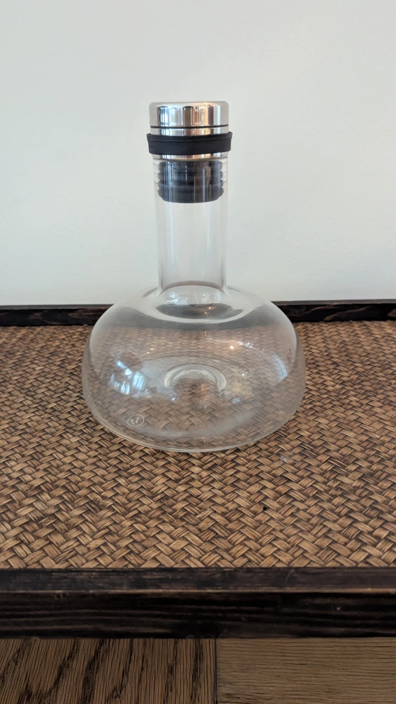 Classic glass decanter. Round shape with a long neck. Features a silver-toned stopper. You will be ready to unwind when using this beautiful item.