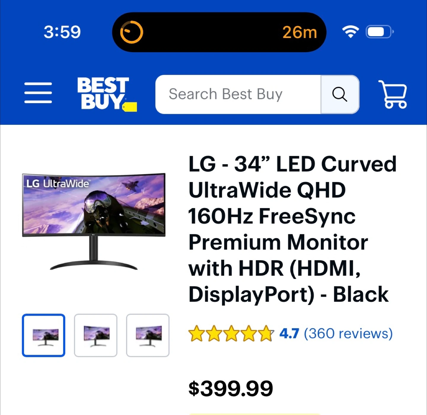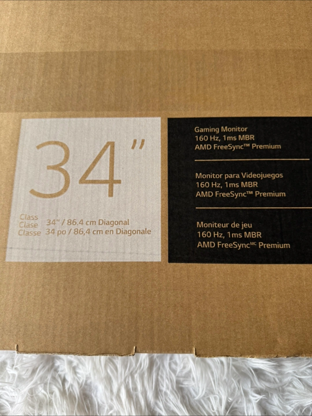 - BRAND NEW Gaming Monitor - Unboxed - - LG V UltraGear™ 34” Curved - Screen Size 34 Inches Curved, VA Panel - Resolution UltraWide QHD, 160 Hz, 1 ms MBR - AMD FreeSync™c Premium With HDR 10 - Aspect Ratio 21:9 - Image Contrast Ratio 3000:1 - Great for gaming, this ultra-wide QHD (3440 x 1440, 21:9 aspect ratio) curved monitor immerses you in the action and increases your field of view, allowing you to see more on-screen.Specific uses for product - Gaming - A high native 160Hz refresh rate with 1-millisecond Motion Blur Reduction (MBR) keeps you firmly in the action while reducing blur and ghosting, helping you to respond to opponents quickly - With HDR10 support and color performance with 99% coverage of the sRGB spectrum, you'll see the game as the developers intend, with accurate and vivid color - AMD FreeSync Premium manages refresh rate, reducing screen tearing, flicker, and stuttering for an effortlessly smooth gaming experience with supported video cards such as the AMD Radeon series - Dynamic Action Sync helps reduce input lag to help you respond to on-screen action quickly. Black Stabilizer dynamically brightens dark scenes to help you find enemies in the dark. Enhance your accuracy in firefights with the Crosshair feature - Purchased for $399 + tax = $439,99 - Asking $379 or best offer.